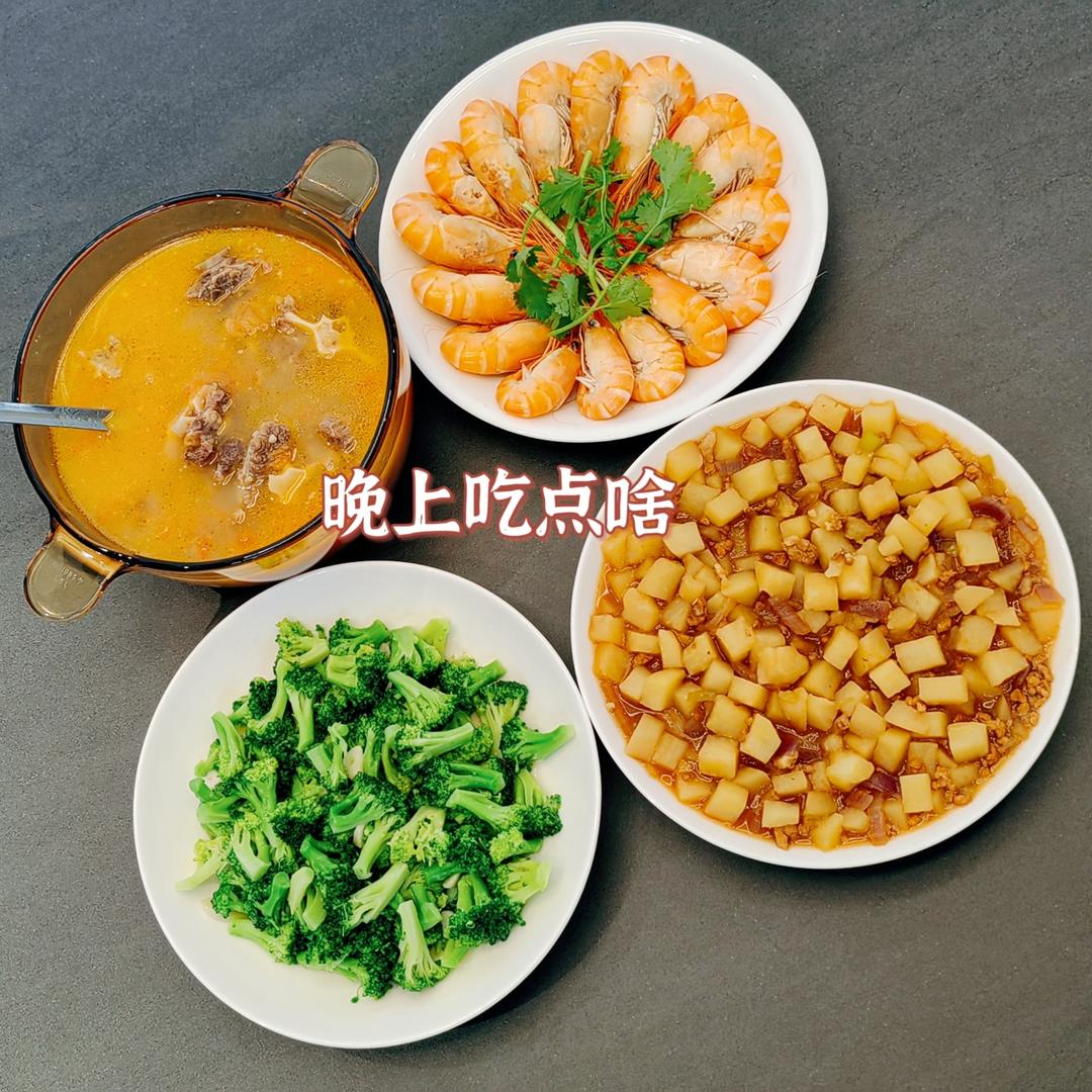 西兰花+肉末烧土豆+沼虾+牛尾汤
