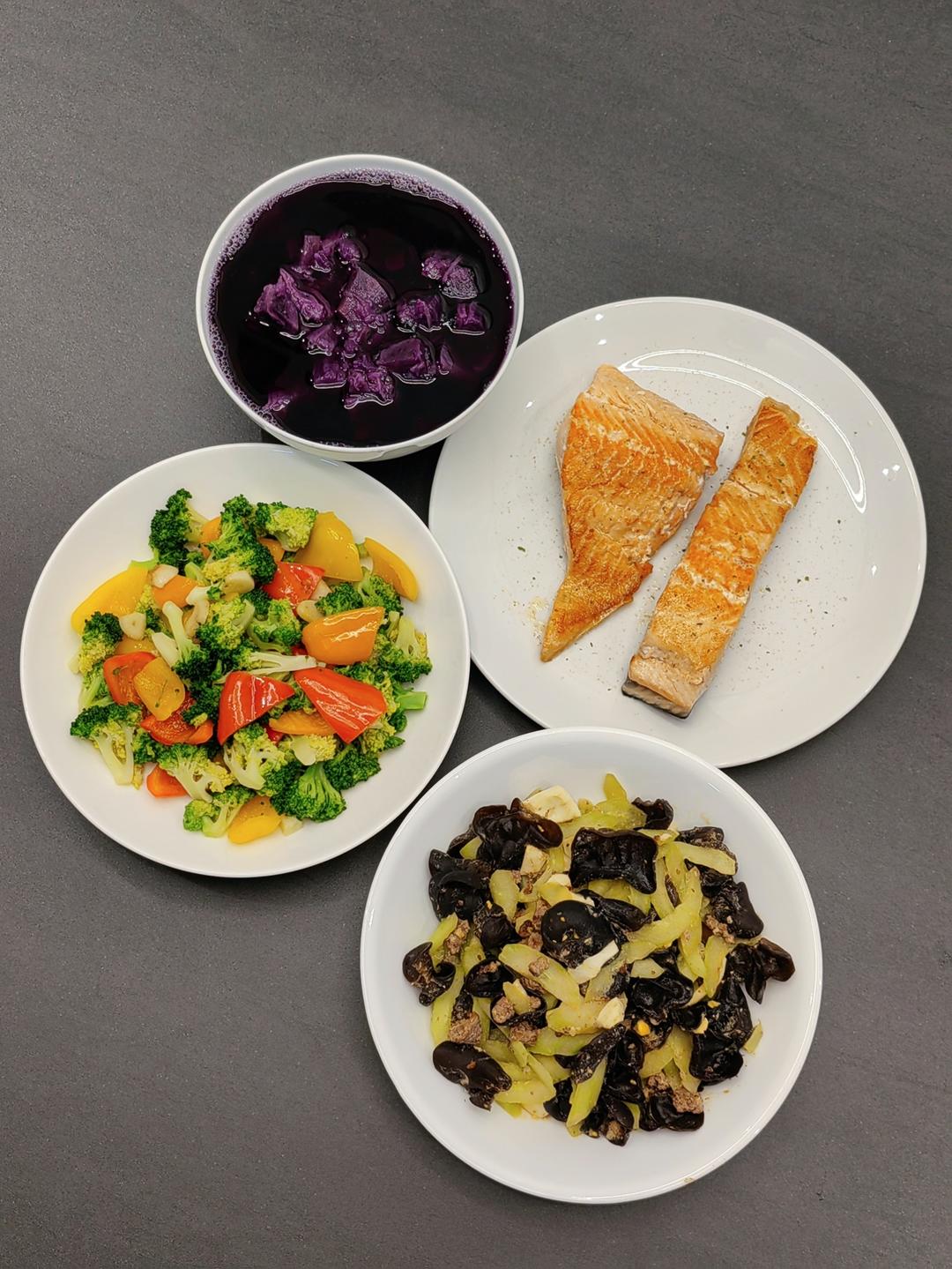 彩椒西兰花+黑木耳黄瓜牛肉末炒一个白煮蛋+煎三文鱼+紫薯汤汤