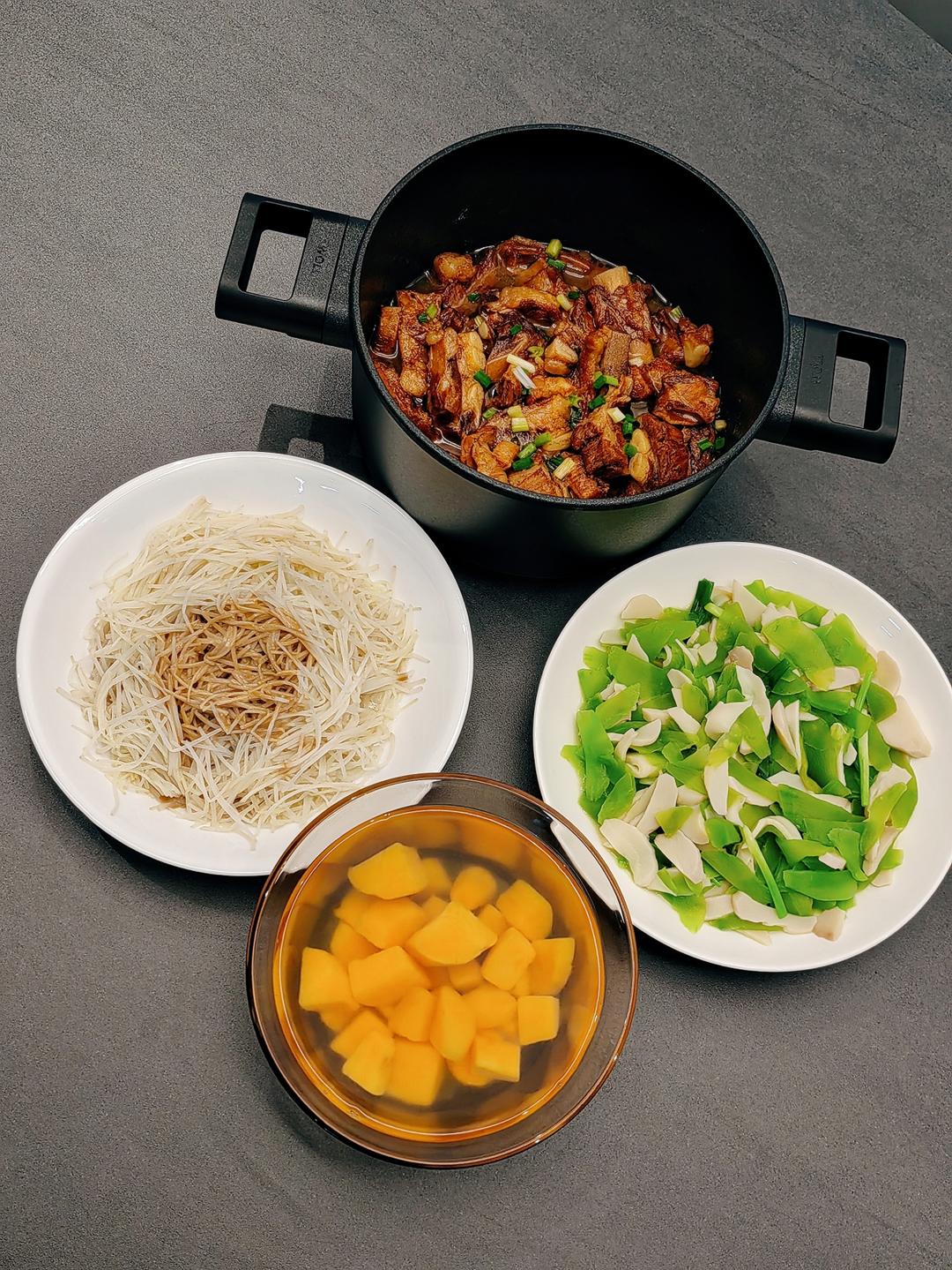 麻酱拌绿豆芽+红薯汤汤+杏鲍菇炒莴笋+红烧肋排块