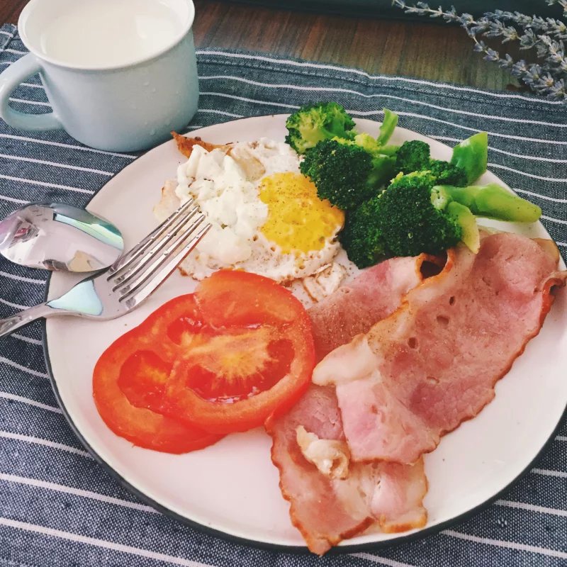 培根,鸡蛋,西兰花,只加盐调味。配一杯纯牛奶,低脂的。