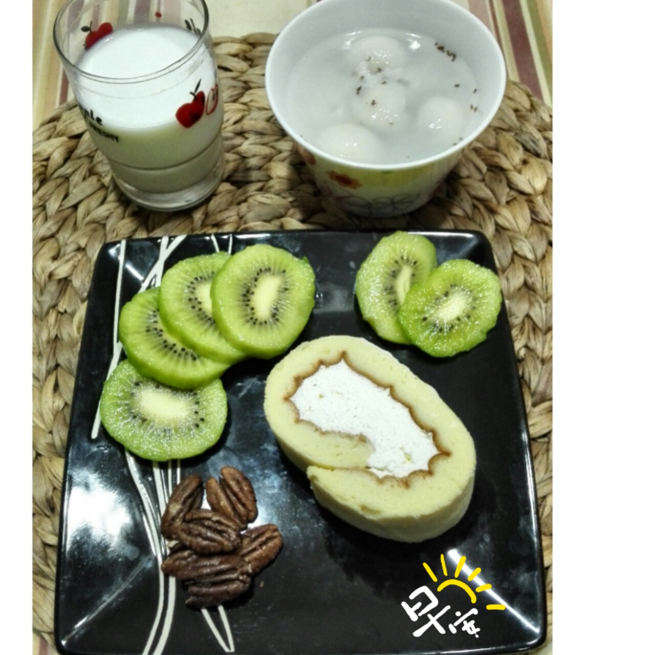 今天早餐~奶油蛋糕卷~桂花米酒汤圆~猕猴桃~碧根果~牛奶