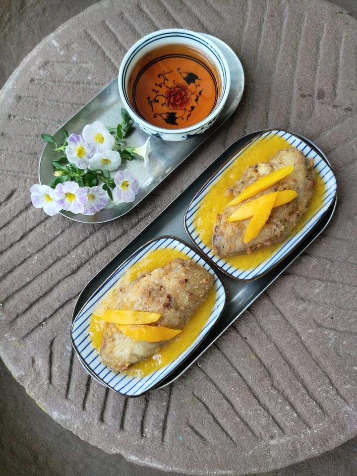 剁好的鸡肉加芒果粒加鱼露蒜蓉南姜末柠檬汁糖拌匀腌制,裹上蛋液红薯淀粉面包糠(自己做的面包烤干碾碎)炸。芒果...