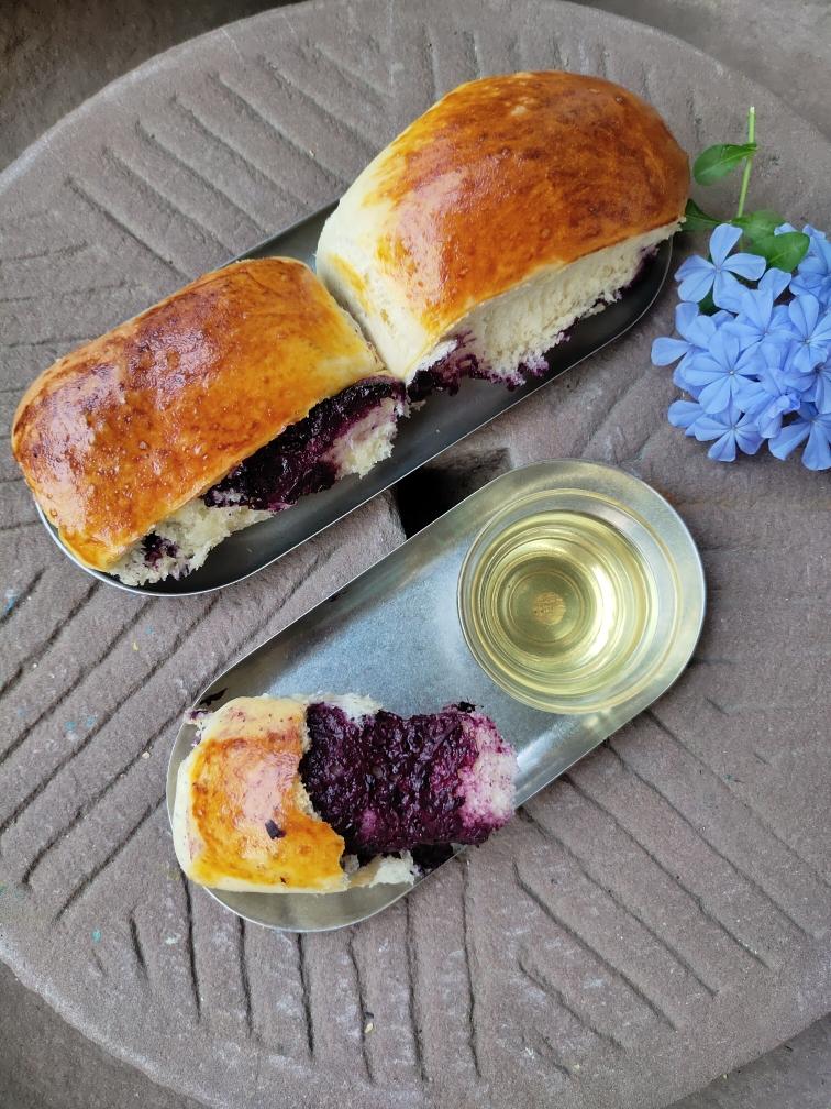 蓝莓酱放太多,有些露馅。橄榄型包法,放在模具里太挤,方了。口感有些偏干。