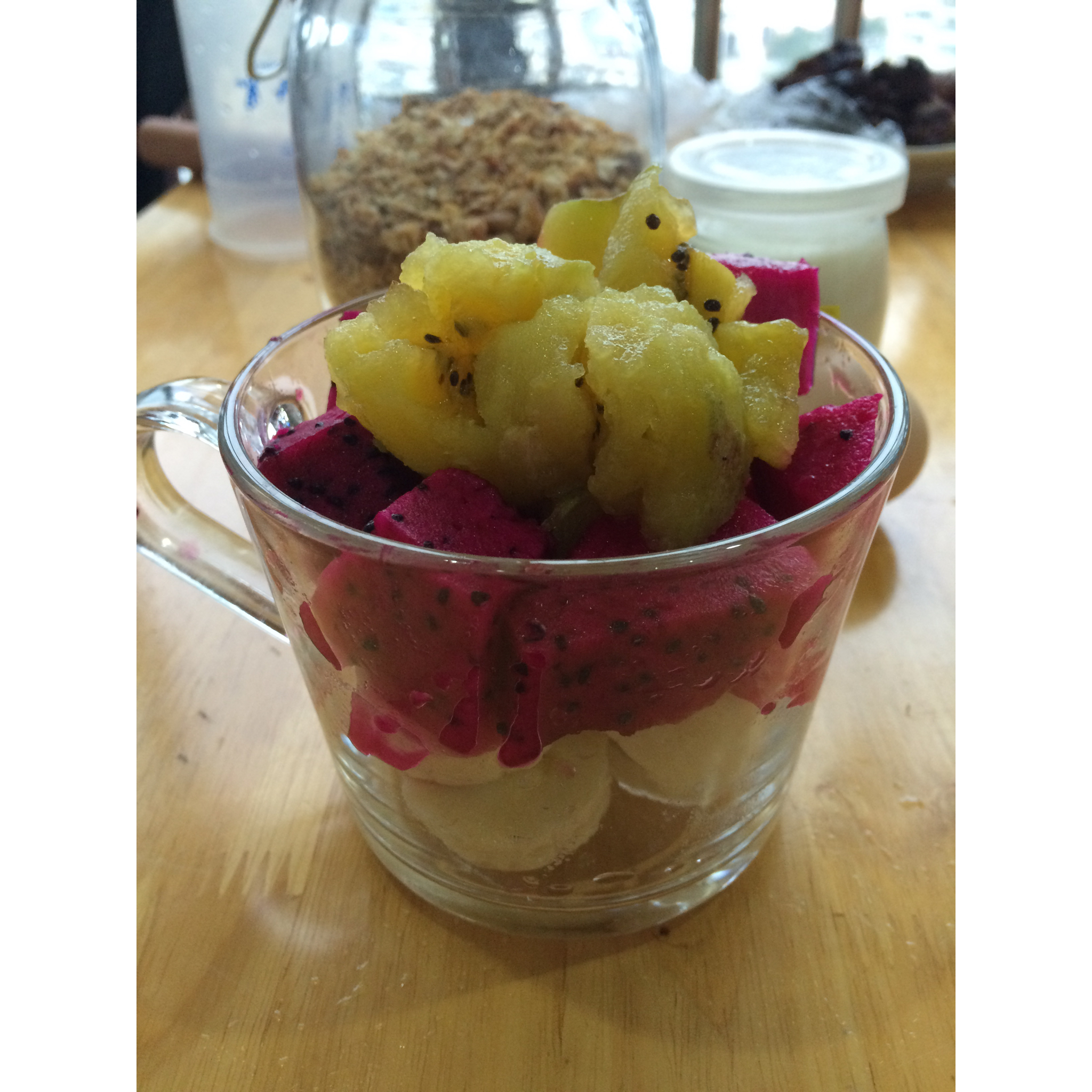Mr.Yao出门前帮我切好的水果,我洗漱好倒酸奶撒格兰诺拉,开吃!