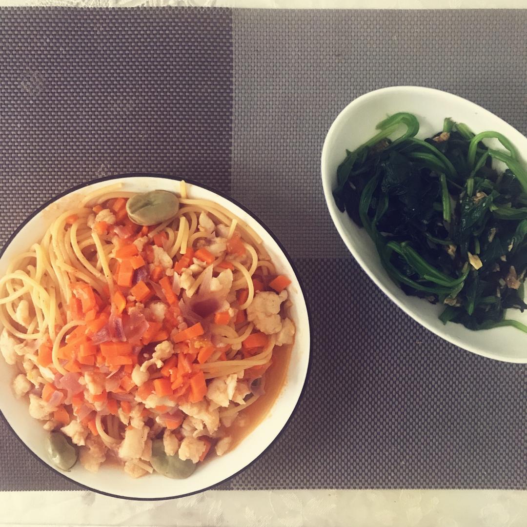今日午餐:番茄龙利鱼洋葱胡萝卜蚕豆意面+凉拌菠菜