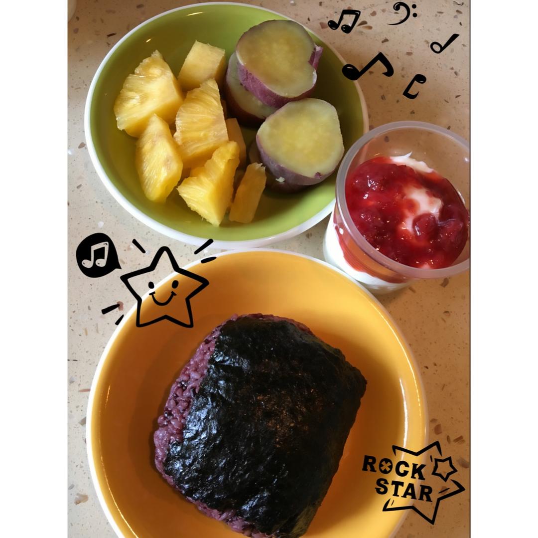 酸奶佐自製草莓果醬假冒草莓新地、自製海苔紫米飯糰(肉鬆+蘿蔔乾+炒蛋餡)、蒸蕃薯、鳳梨 #早餐•2017年...