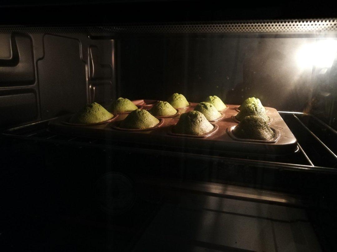 超爱老师玛德琳,不记得第几次做了,第一次做抹茶玛德琳!五克抹茶粉换等量低粉,调低五度底火,焖五分钟出炉