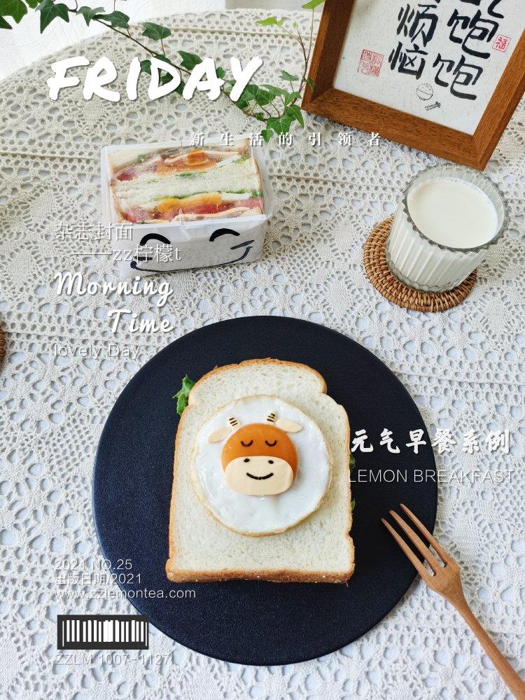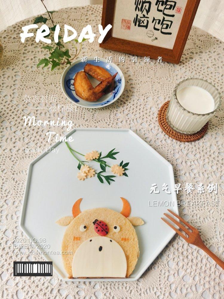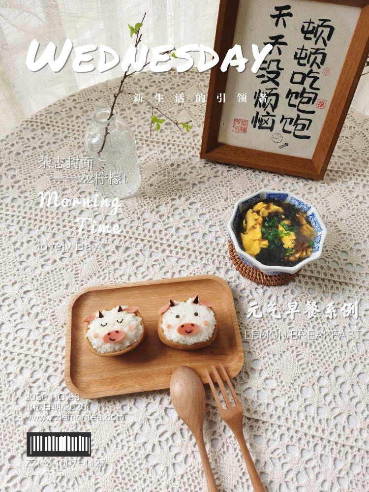 之前做过的牛牛手抓饼造型,加几块黑色花纹就是奶牛啦,花纹和表情都是海苔叠...