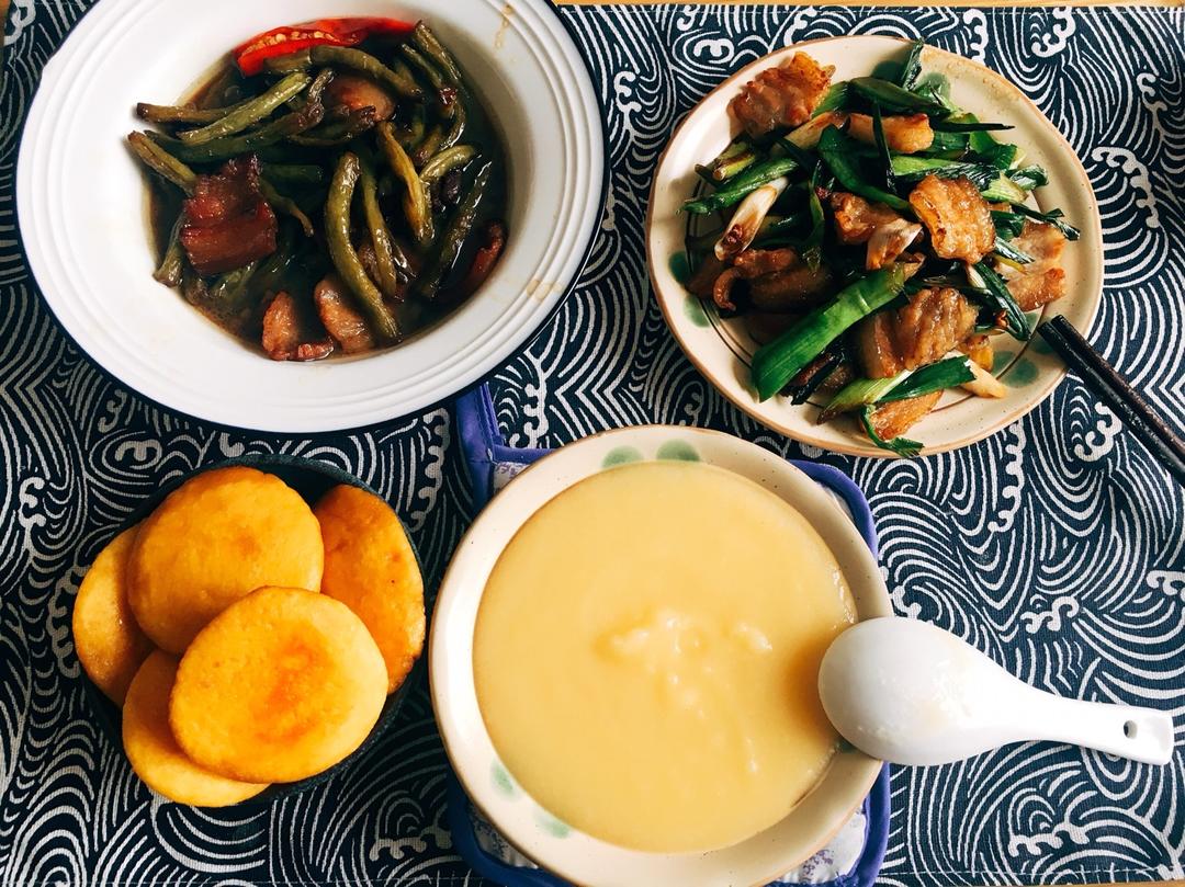 炖豆角+蒜苗炒肉+玉米面粥+玉米面饼子