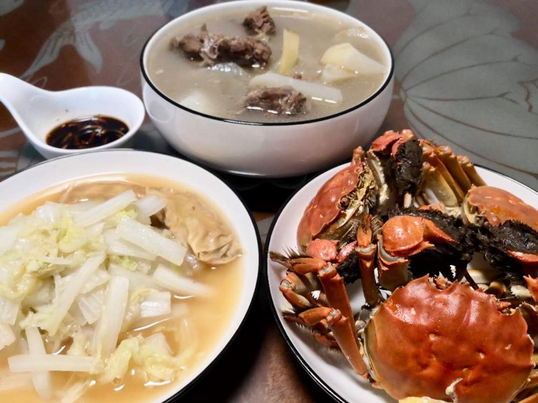 眨眼立冬,个么羊蝎子炖萝卜汤喝起,秋末的大闸蟹还是要露脸的,南方的天还停留在春夏天,四季齐全了
