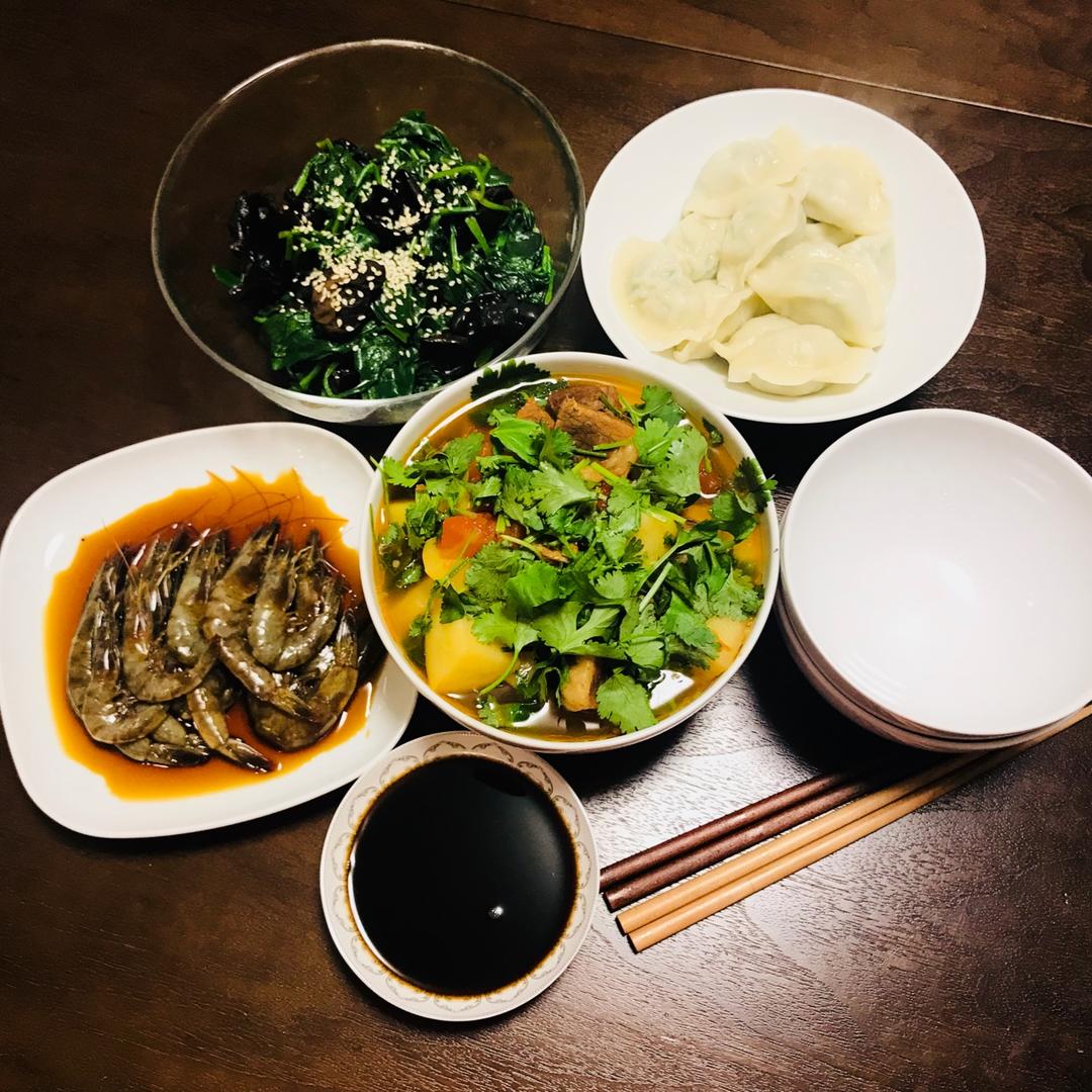 二人食|醉虾、木耳拌菠菜、番茄土豆炖牛肉、立冬的鲅鱼饺子