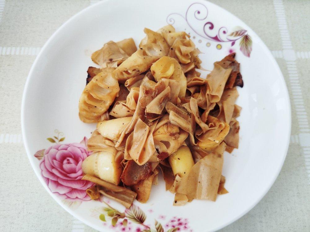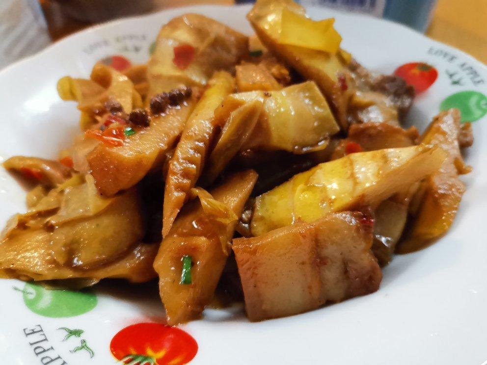 收到的春笋还带着泥,好新鲜,就是三根剥完变得有点少,加了点豆皮一起炒,好吃