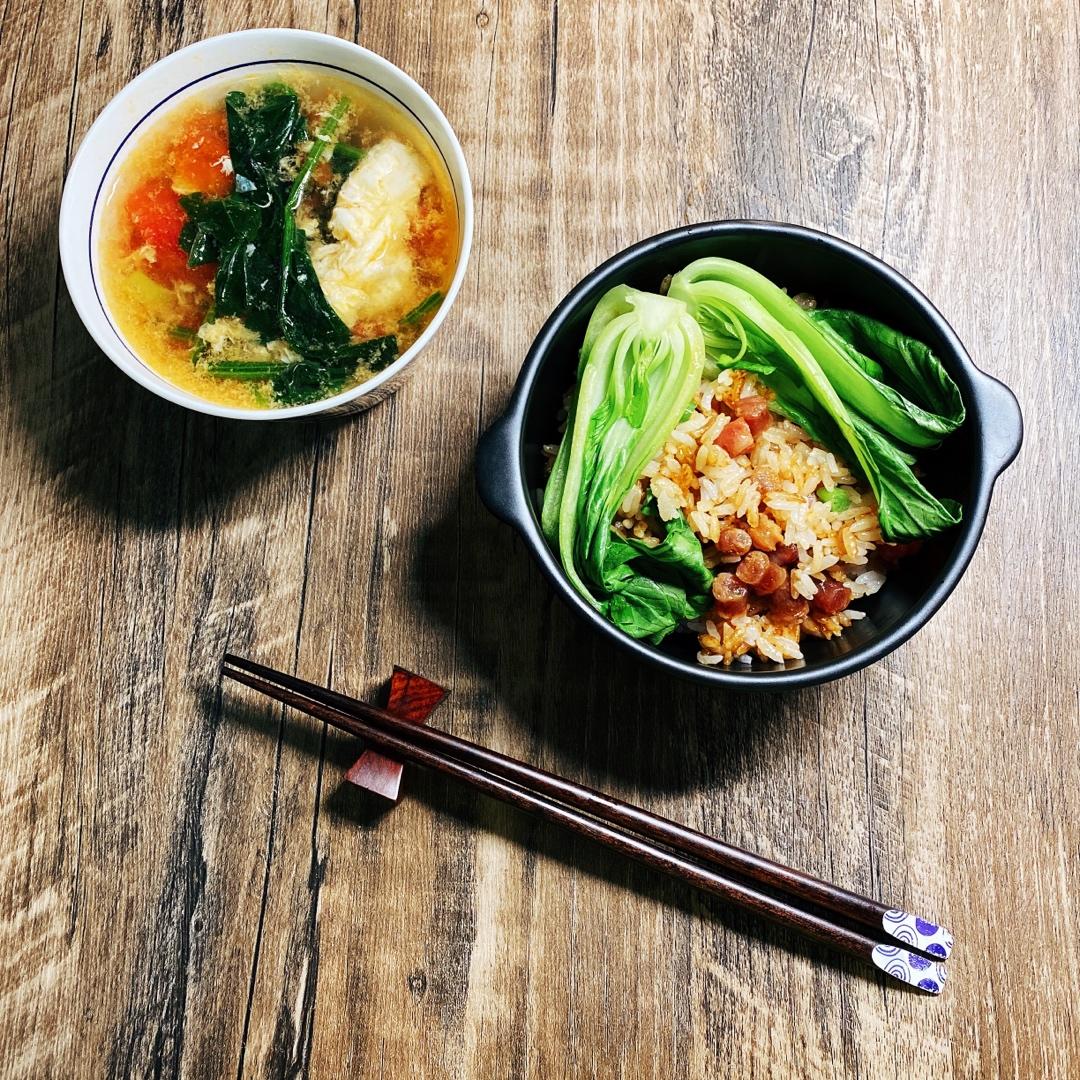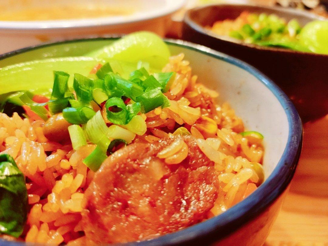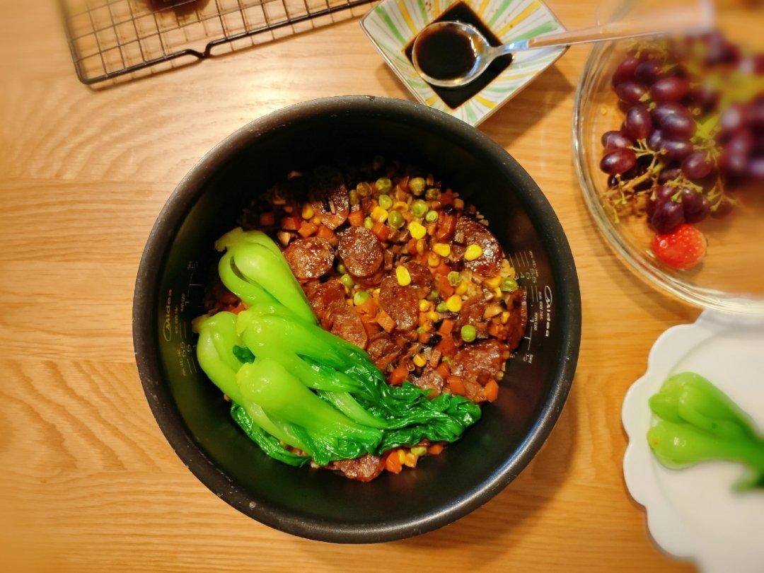 超级好吃的腊肠饭,加了腊肠、香菇、绿豌豆、玉米和胡萝卜,焯了小油菜,调了料汁。太香了😋