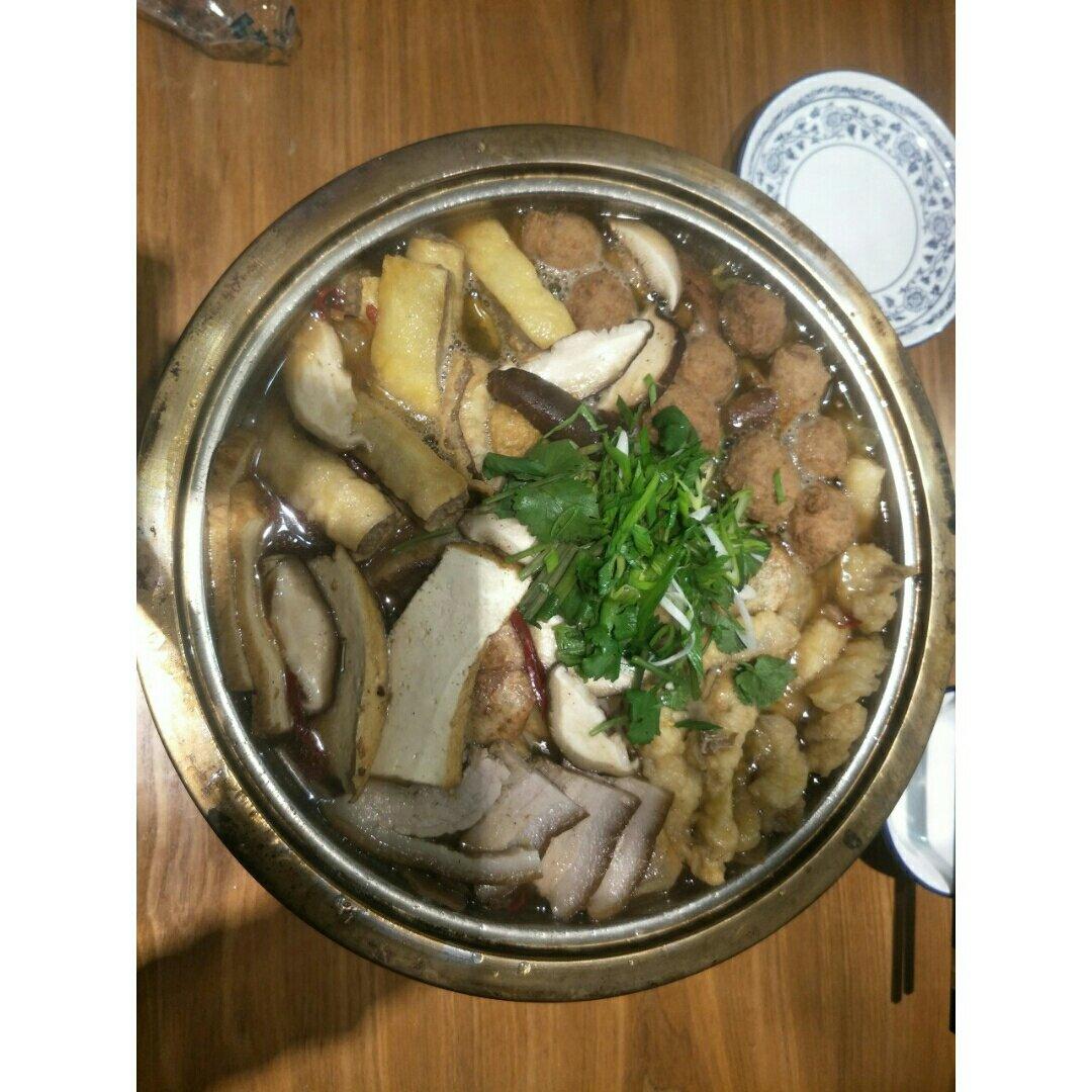 昨天炸的藕丸素丸,今天做的虾仁蛋饺,还有一只福袋,配上白菜豆腐皮和魔芋丝,没...