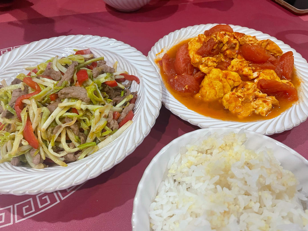 今天时间仓促,只做了三个菜:胡萝卜丝鸡蛋、丝瓜口蘑炒虾仁、青菜牛肉碎。爱人孕...
