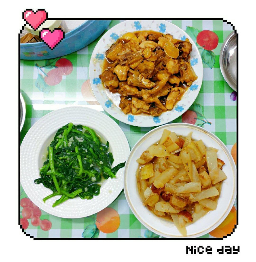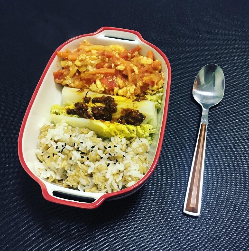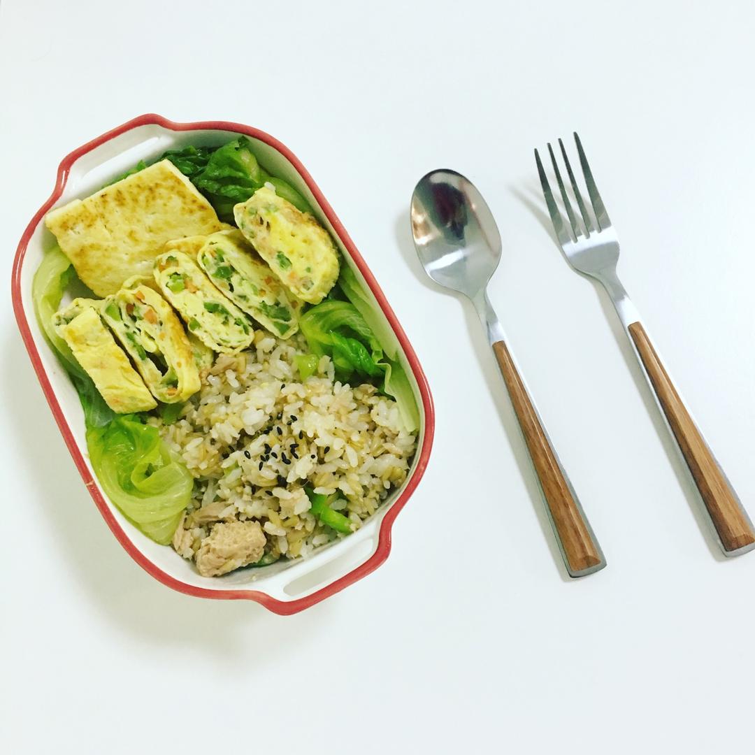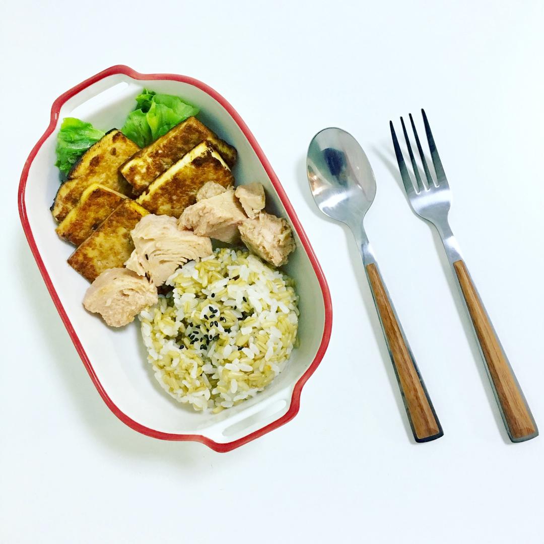 厚蛋烧,生菜,香煎老豆腐,金枪鱼青椒炒燕麦饭