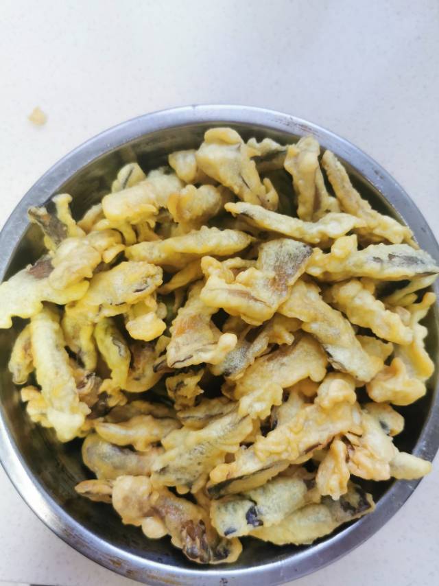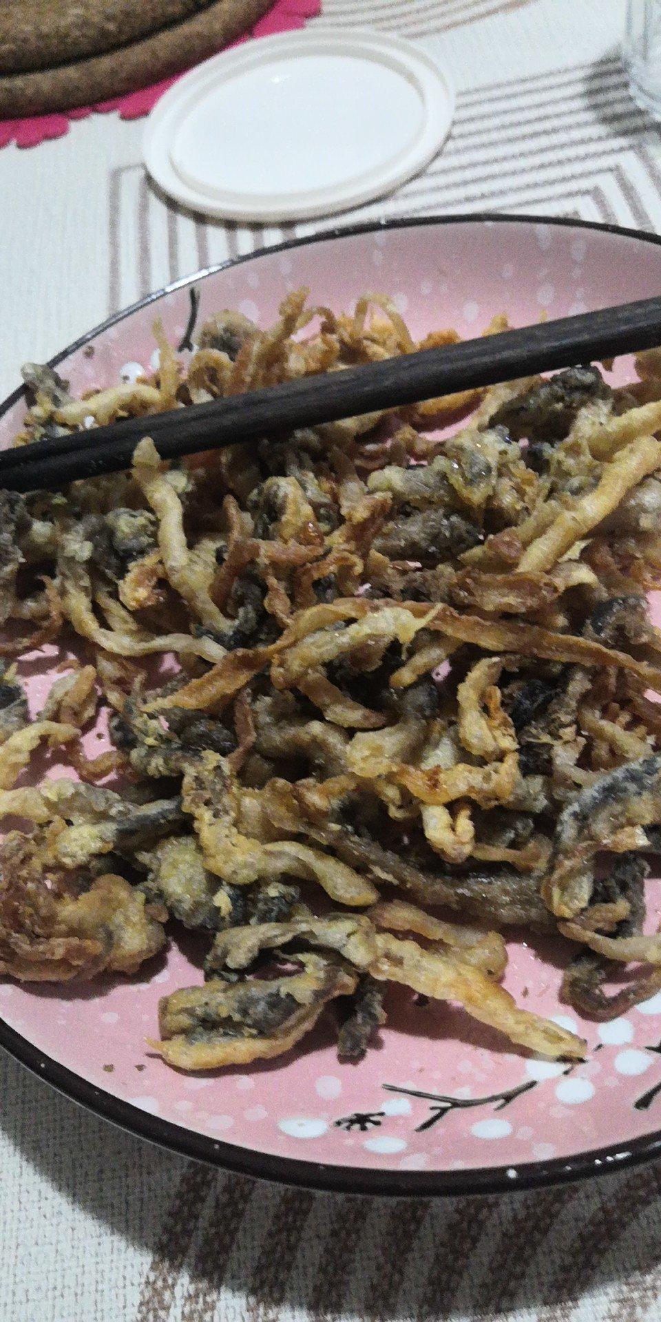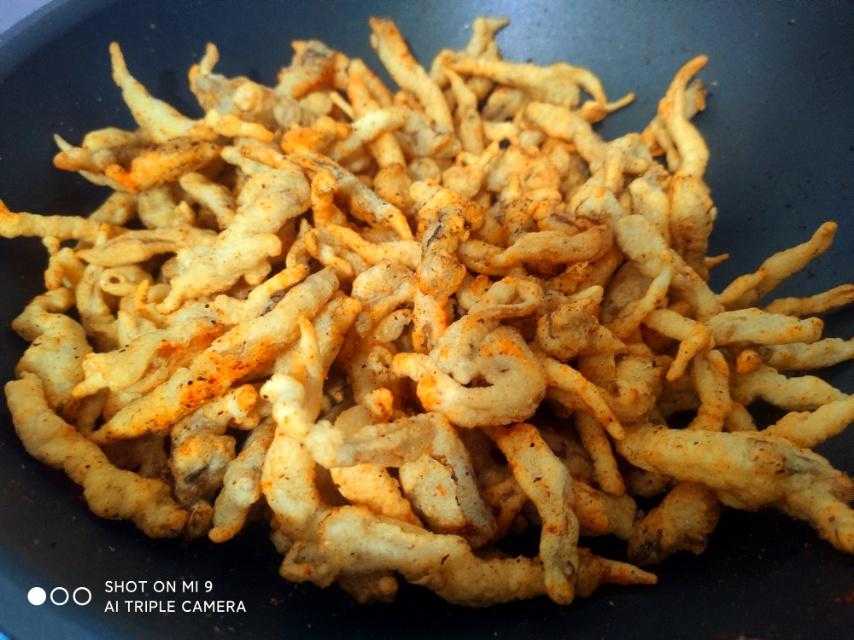 平菇和海鲜菇,撕成条。焯水,去水,裹淀粉和鸡蛋,炸两遍