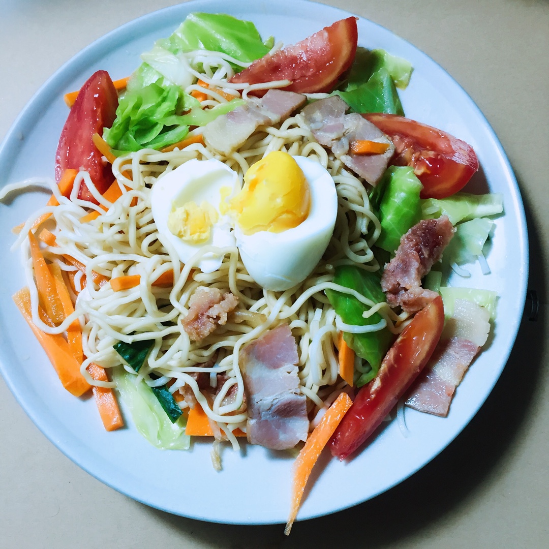 材料:胡萝卜丝、黄瓜丝、培根、鸡蛋、番茄、肉片、小包菜、面条