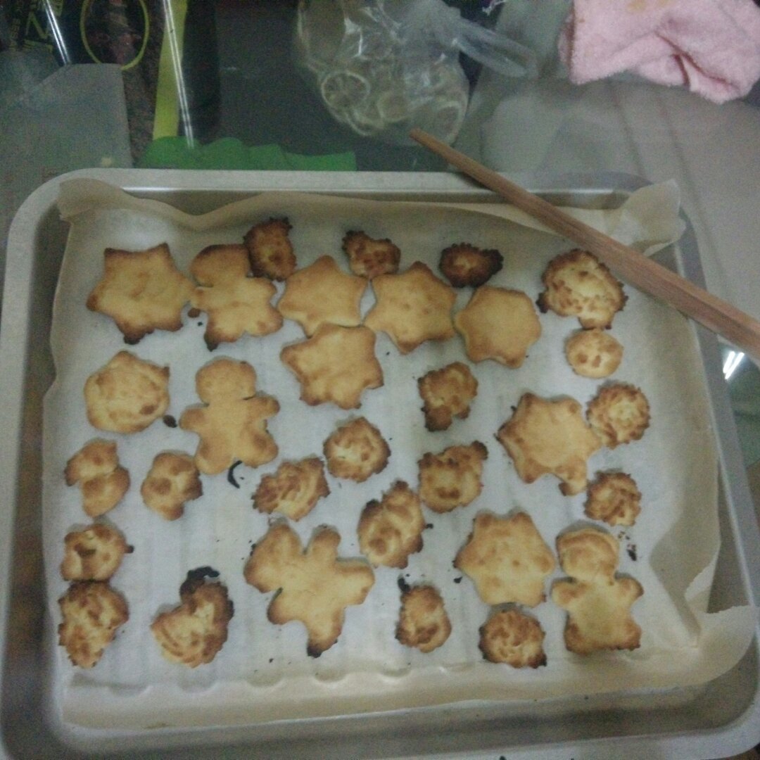 根据原方子用料。第一次用食用玉米油取代黄油,真心没有黄油饼干香和酥!外观还可以,口感略差~比黄油做的...