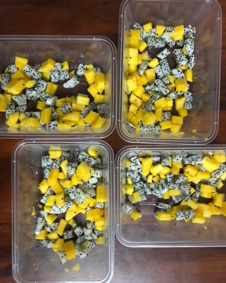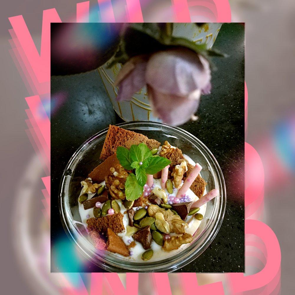 给儿子做的放学点心,红心火龙果,香蕉酸奶(自制酸奶),上面洒各种饼干,放了一点巧克力,薄荷草和珍珠彩珠糖做装...