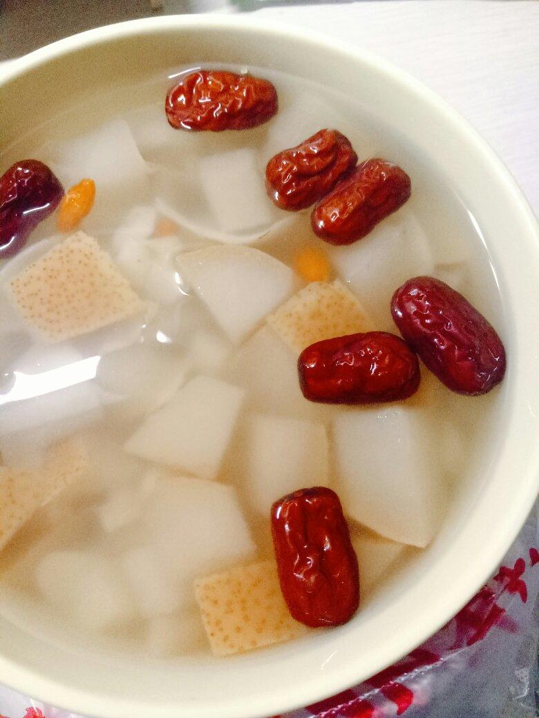 雪花梨,荸荠,百合,枸杞,小枣,冰糖,爱心~配以耐心和期待少许~小火慢煮~在宿舍插着变压器瞒着阿姨煮的,希望...