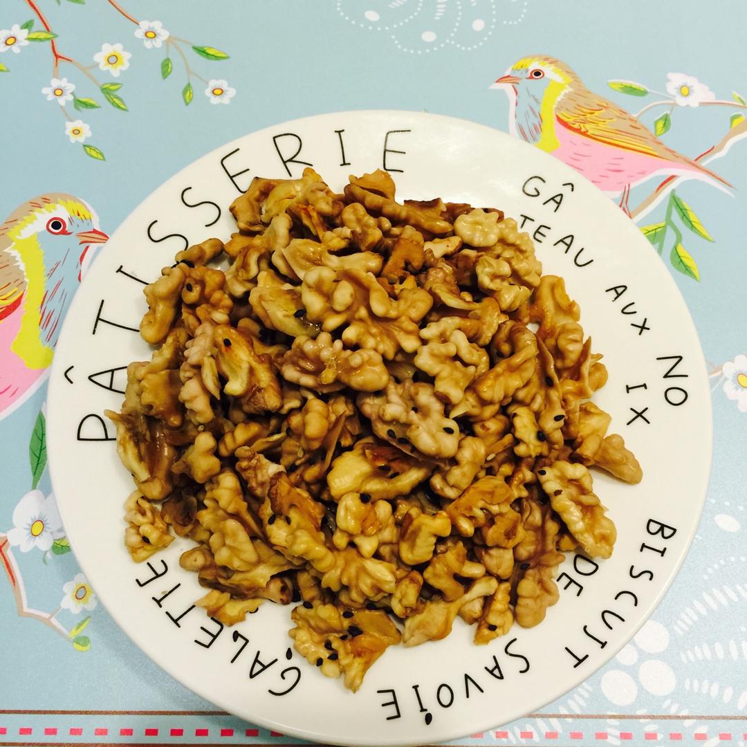 本人特别受不了核桃的生涩味儿,于是费劲儿把皮剥掉了,然后刷糖水撒黑芝麻入烤箱200度三分钟,出炉还有拔丝效果呢!口感香甜...