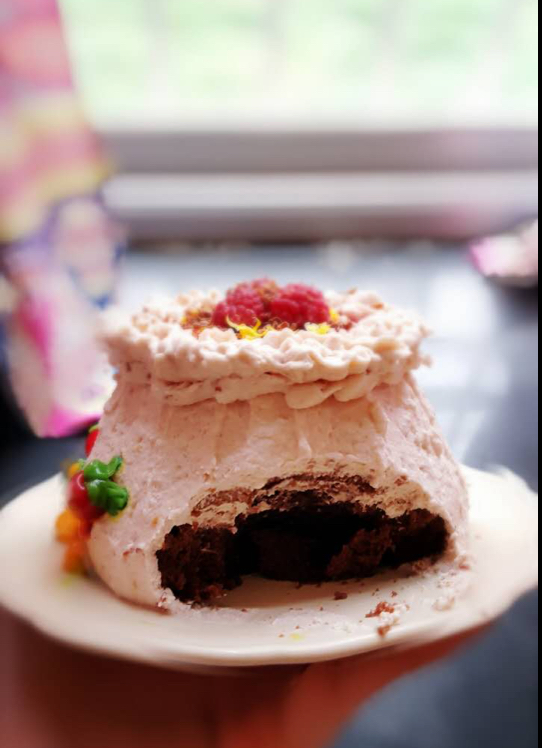 奶油加了覆盆子酱,颜色和口味真的太棒了,冷藏后像冰淇淋的味道,和可可戚风搭配很是好吃呢。 #晚餐•2015年11月19日...