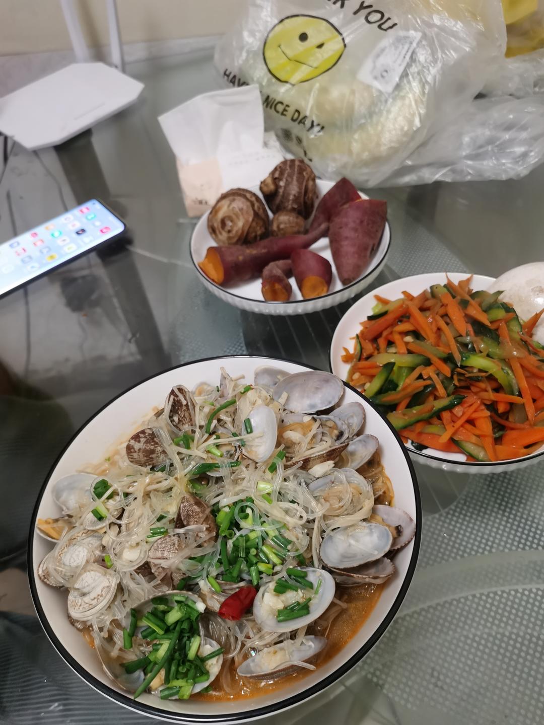 花甲粉丝金针菇煲+胡萝卜炒黄瓜