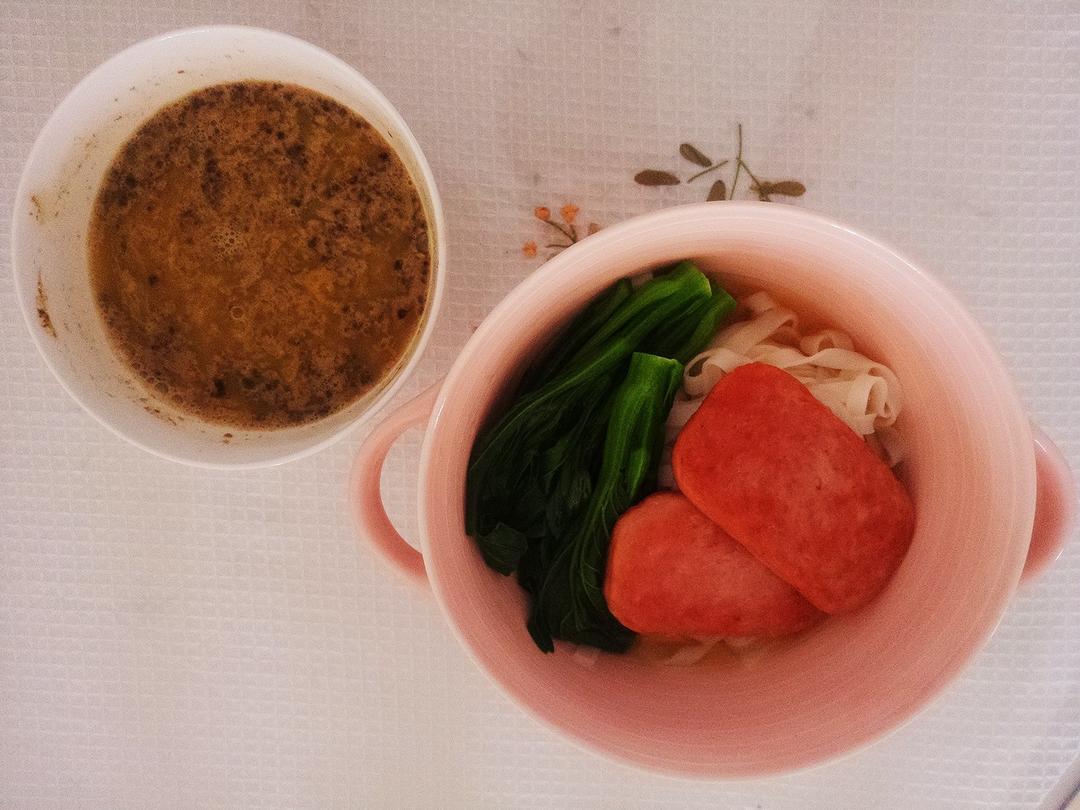 葱油麻酱面+猪肉蒸饺+火龙果香蕉汁+拌菠菜+煎蛋煎杏鲍菇 *合力呼唤江南的太阳快粗来*