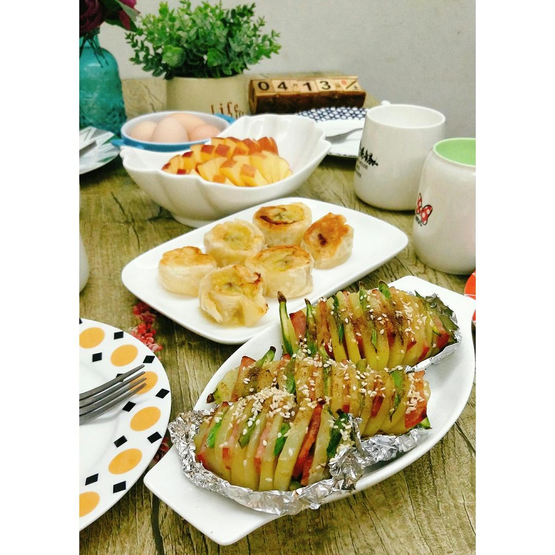 芦笋培根风琴土豆&香蕉酥卷&水煮蛋&牛奶&...