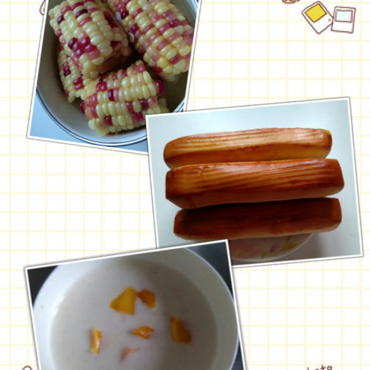芒果酸奶、奶酪面包、玉米棒