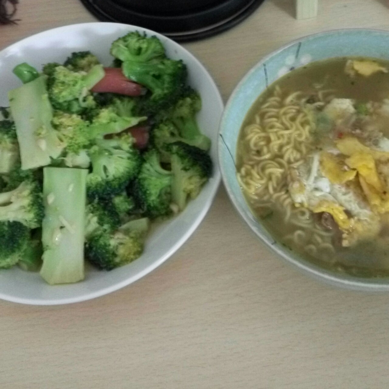 西兰花炒香肠加泡面加煎蛋~即使是泡面,也要对自己好一点!