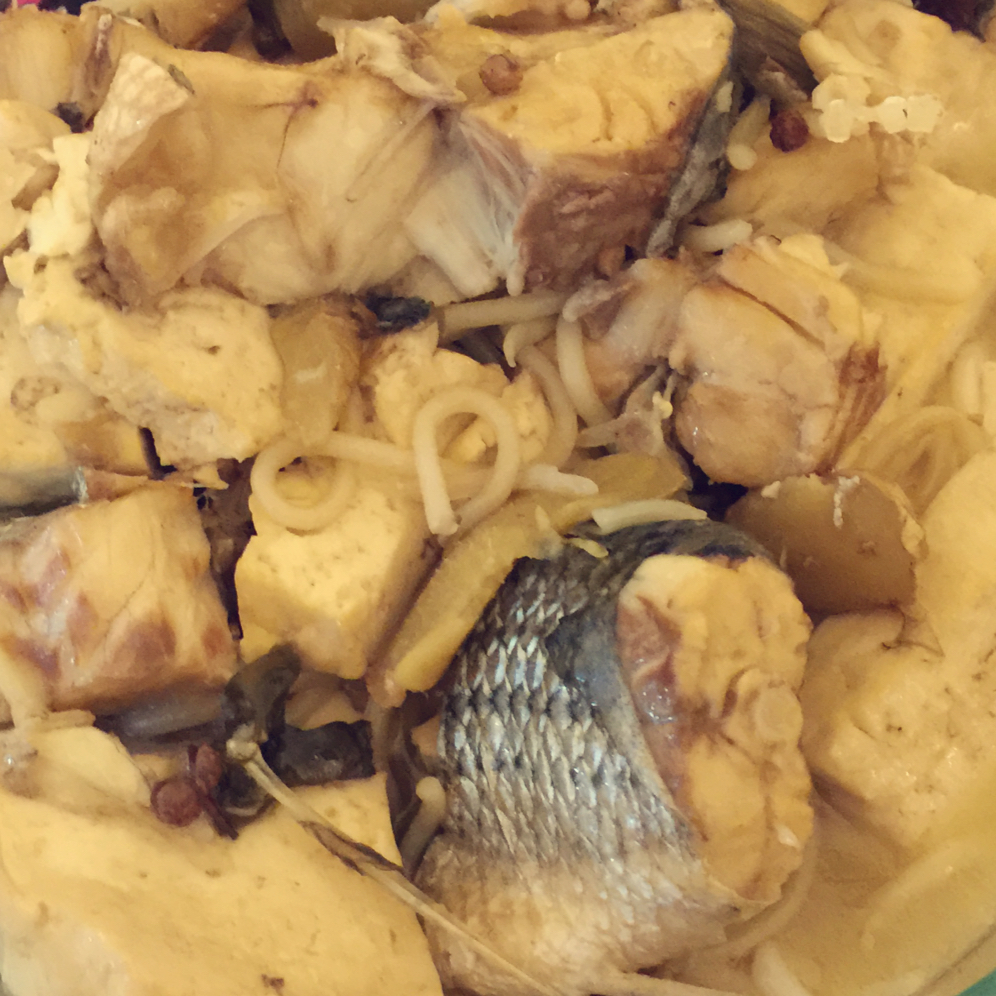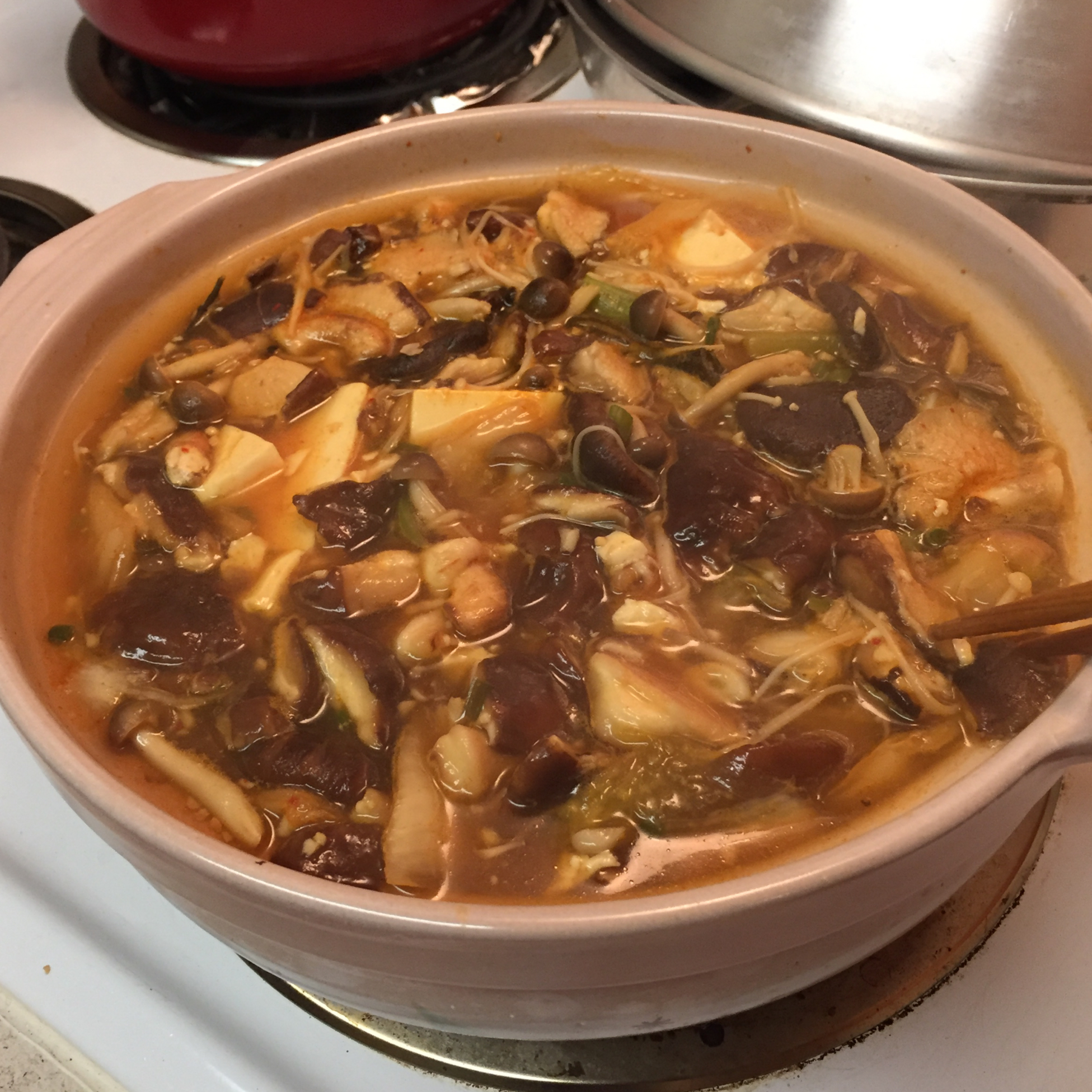 基本上就是先做汤底 不过我只有海带和虾米 然后炒香葱和辣白菜 没有肉 就是金针菇 日本花菇 中国干冬菇 还有那种小小短短...