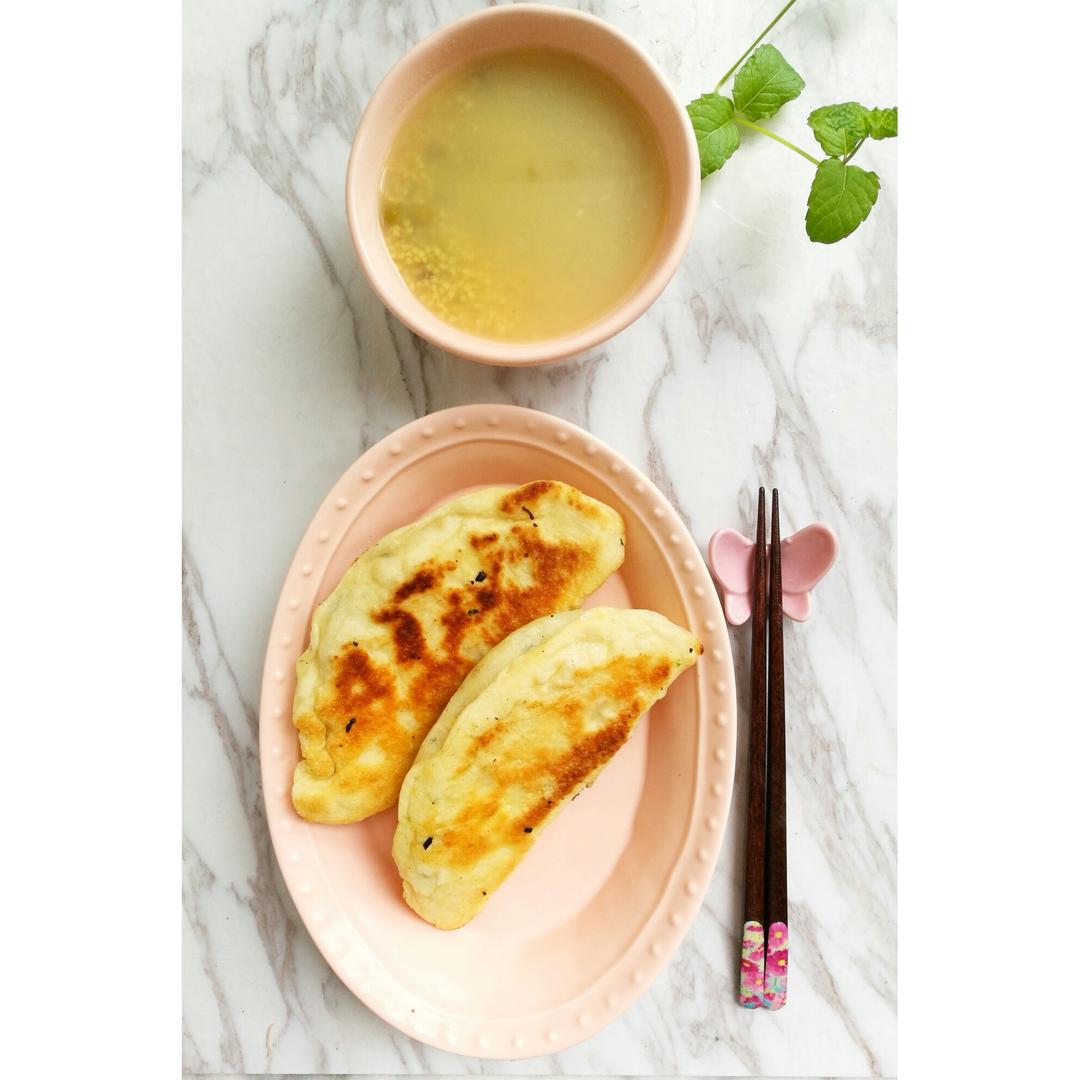 微凉的天气,韭菜盒子+小米粥