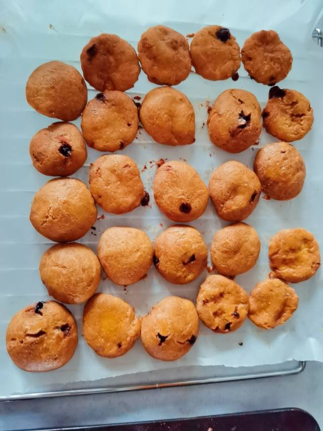 量太多,材料都减半了,糖用的代糖,所以量减到了四分之一,刚好烤一盘。家里只有葡萄干,就放了葡萄干碎。烤箱中层上下170℃...