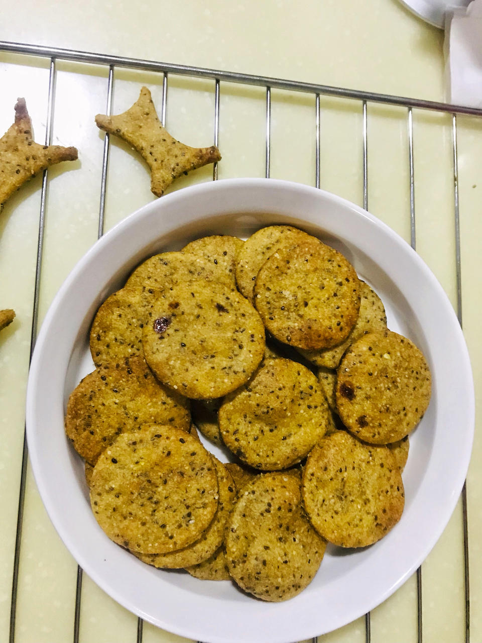 由于烤盘太小,一炉烤不下,于是,形状逐渐放飞自我。。一开始还用圆模压,后来刀切, 最后手撕。。最后一个,用碗扣,我要笑死...
