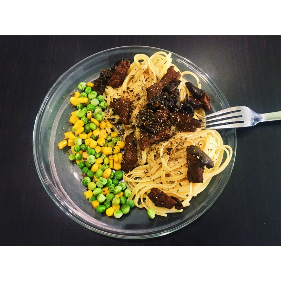 煎了牛肉和香菇作为辅料,煮了最简单的意面🍝