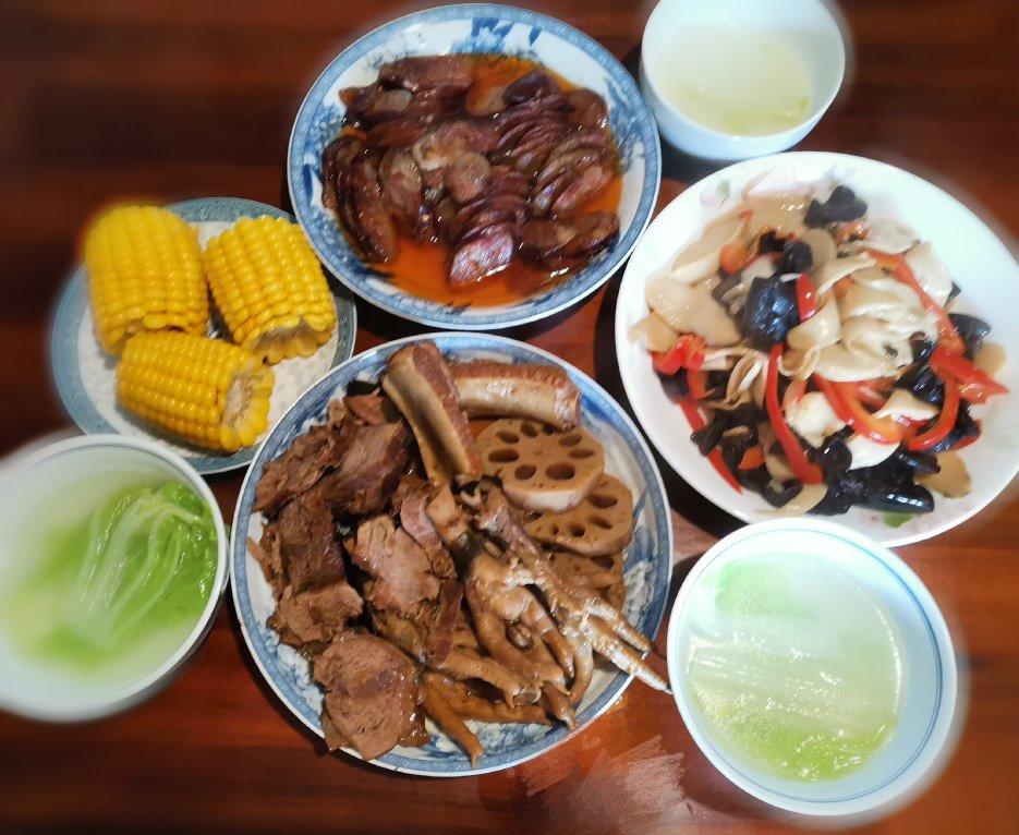 今日午餐:卤味拼盘(排骨,牛肉,鸡爪,海带,莲藕),蒸腊肠,杏鲍菇木耳炒甜椒,白菜汤,蒸水果玉米,主食米...