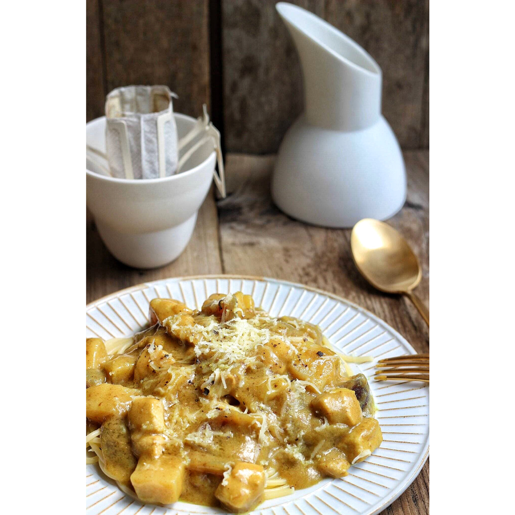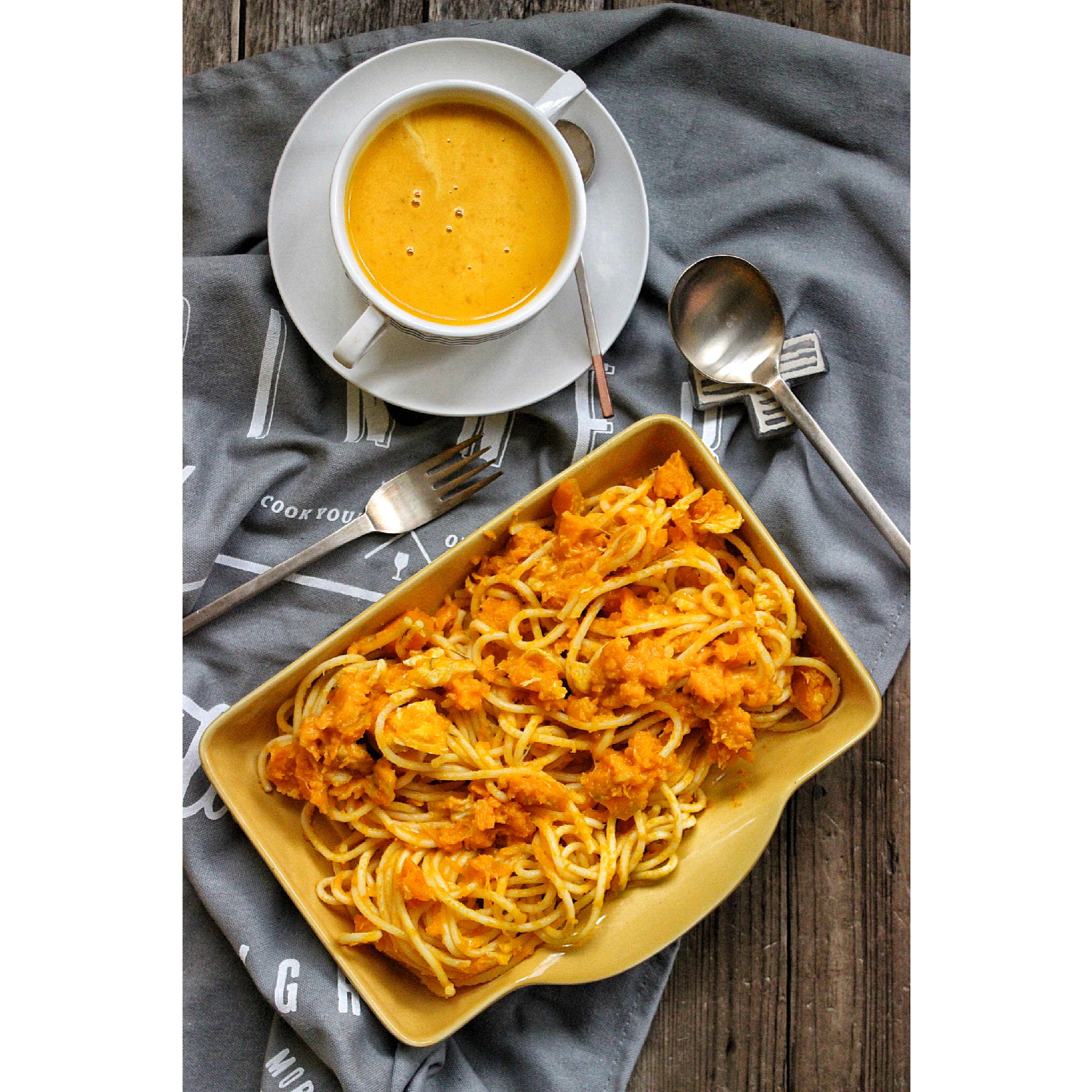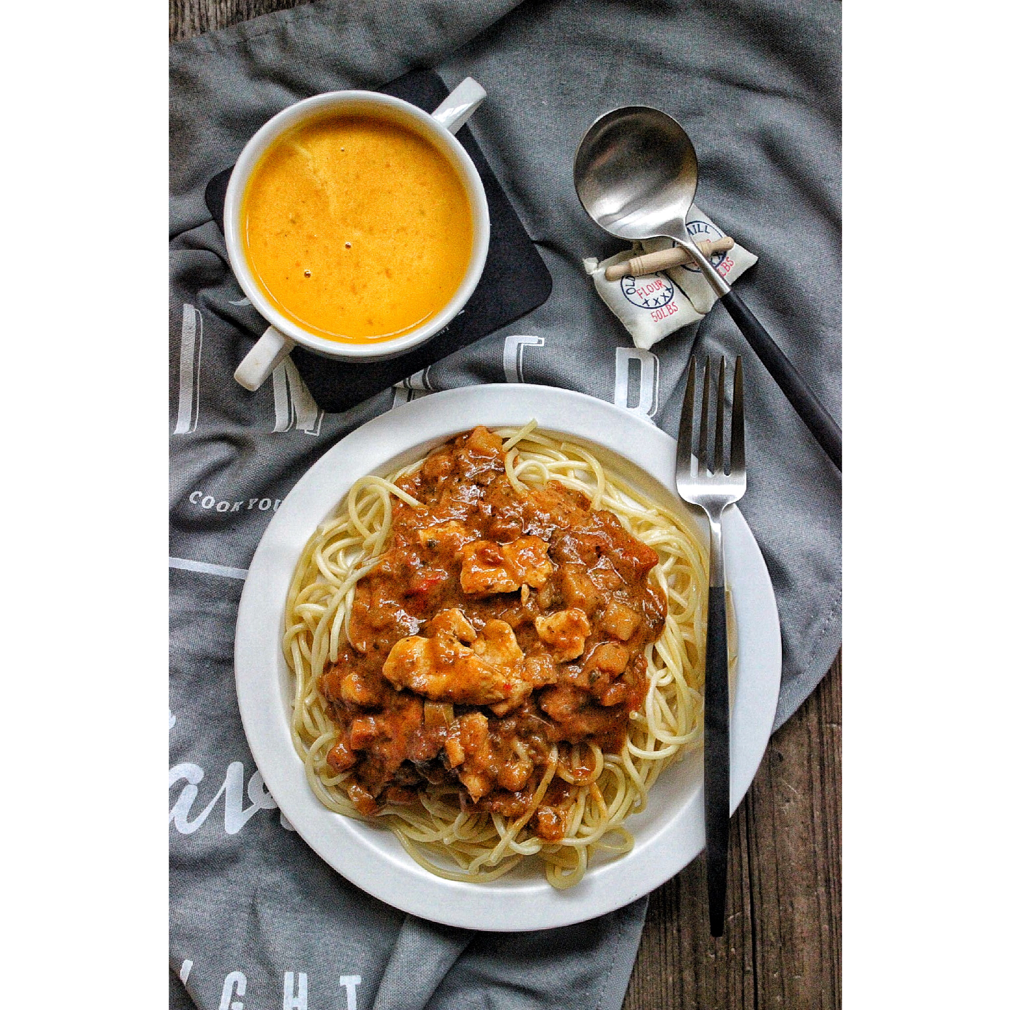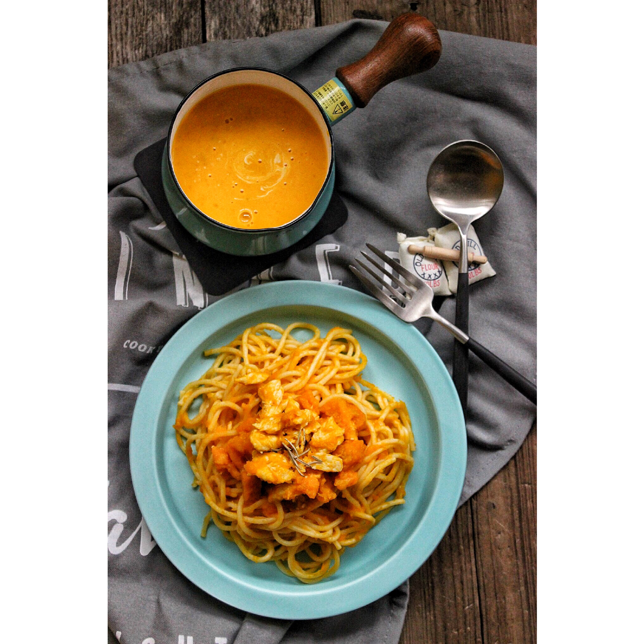 南瓜汤!红咖喱意面加了几块鸡肉!最近天阴的应该要来个ISO12800了吧!