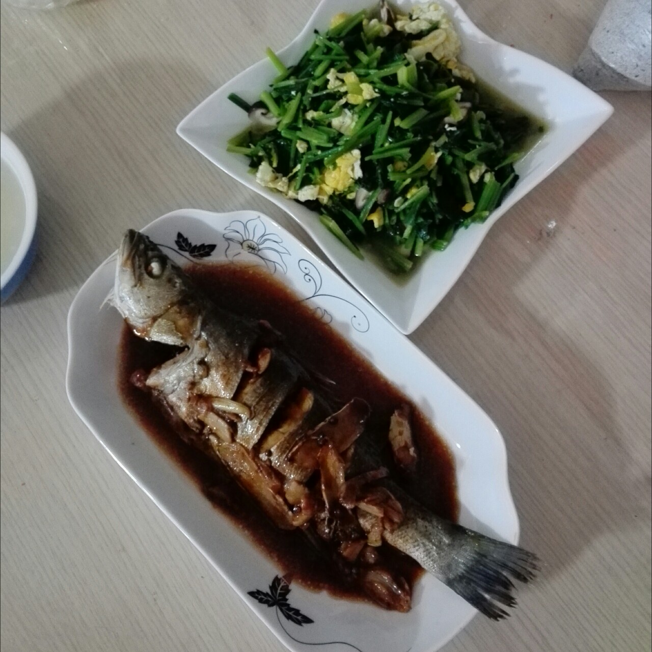 家常烧鲈鱼,菠菜炒鸡蛋