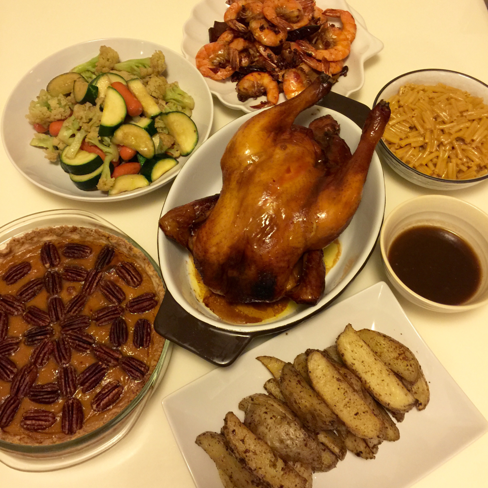 四个人的简单晚餐。火鸡这货看着就被肉饱了,老公建议咱们还是烤只鸡意思意思吧。