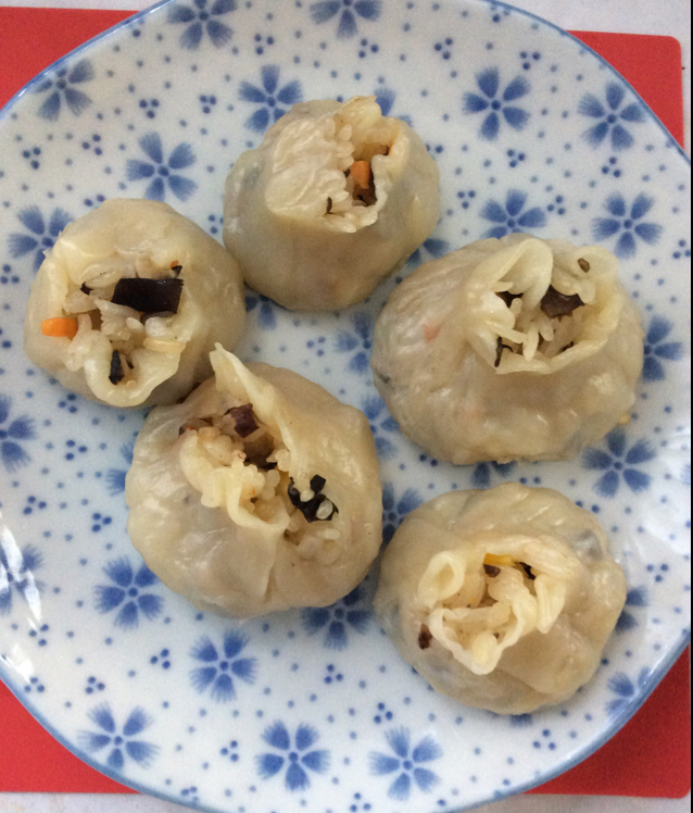 和女儿合作的作品。本来想消耗掉整盒饺子皮的,结果饺子皮发霉了。炒好的糯米粉在冰箱呆了两天后变硬了。按配方揉得很好的烧卖皮...