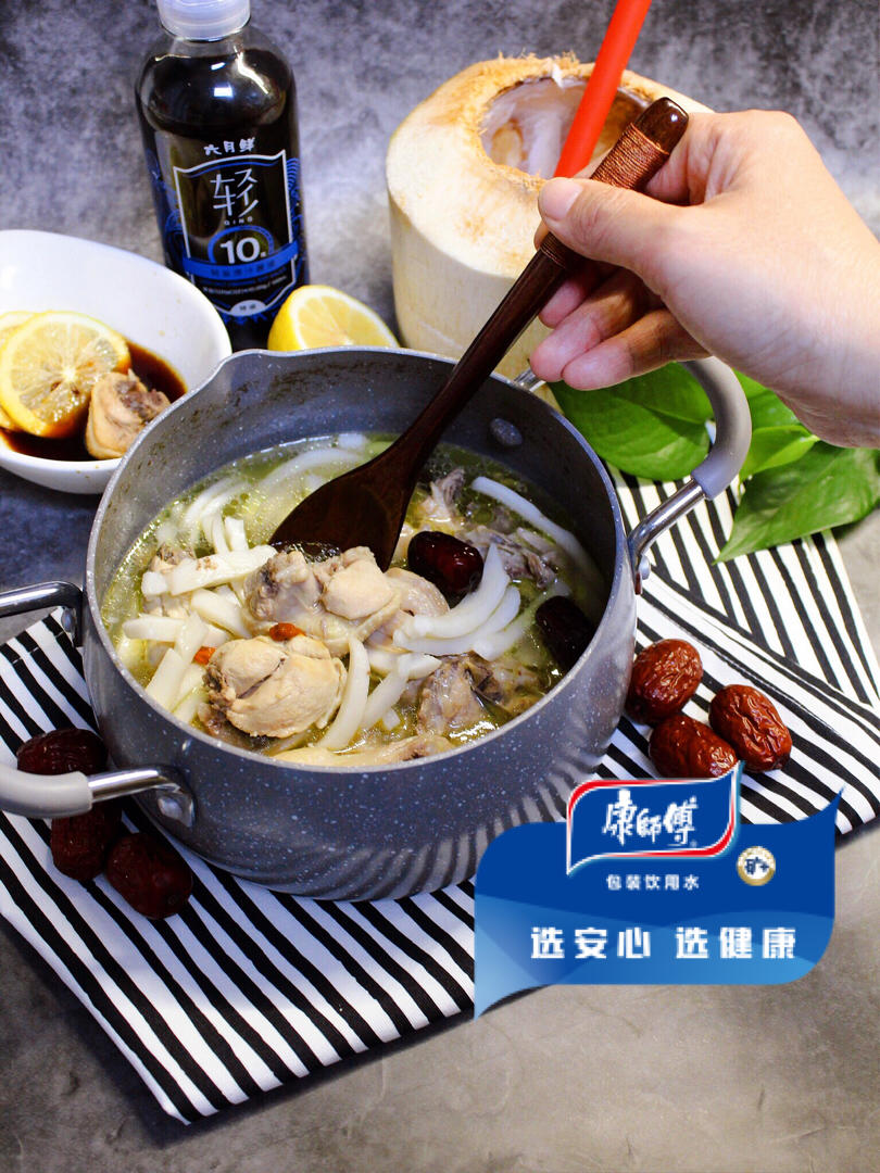 用康师傅纯净水配合椰汁做出的椰子鸡味道更加甜香,鸡肉有弹性,味道都是甜甜的。