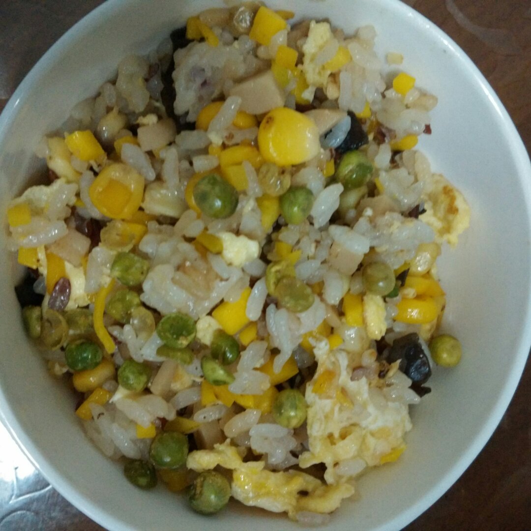 有内容的蛋炒饭(大米,红米,鸡蛋,玉米粒,黄萝卜丁,豌豆,火腿丁,黑木耳)