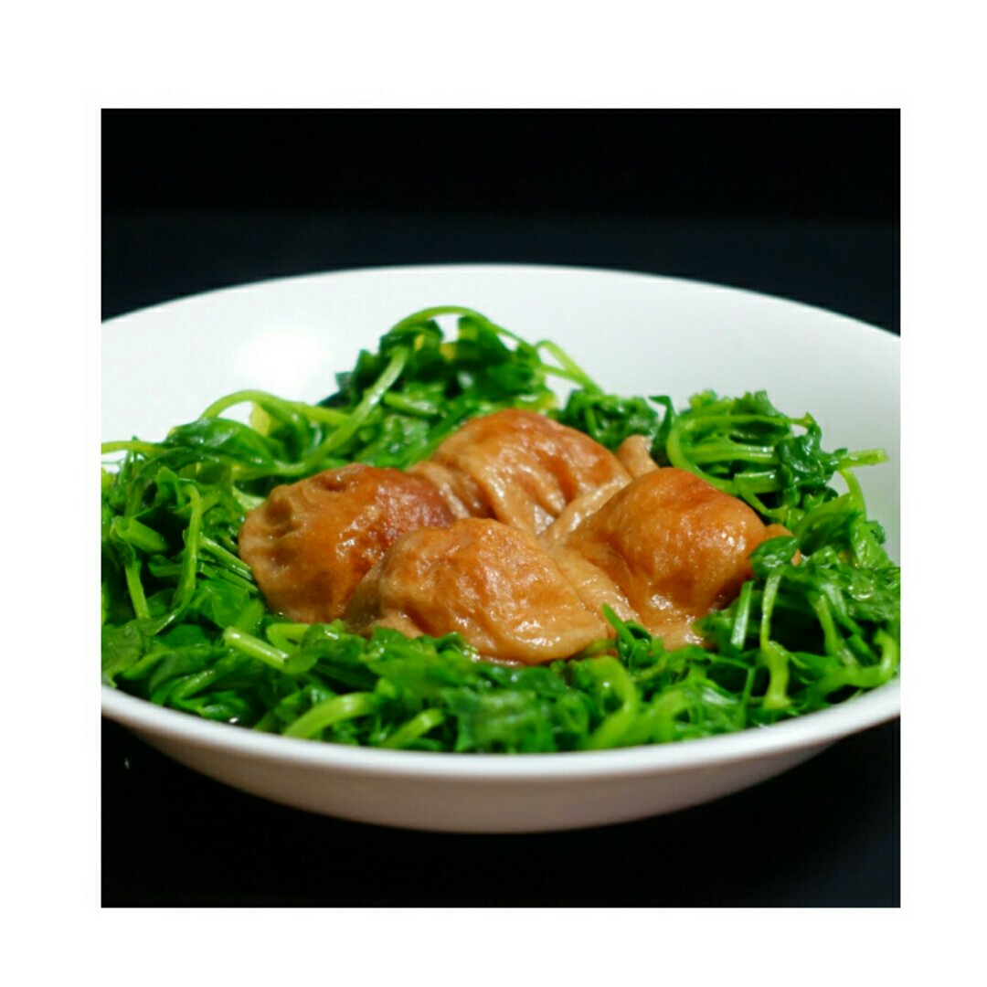 油面筋塞肉拼汆烫豆苗;番茄炒蛋;茭白香干丝