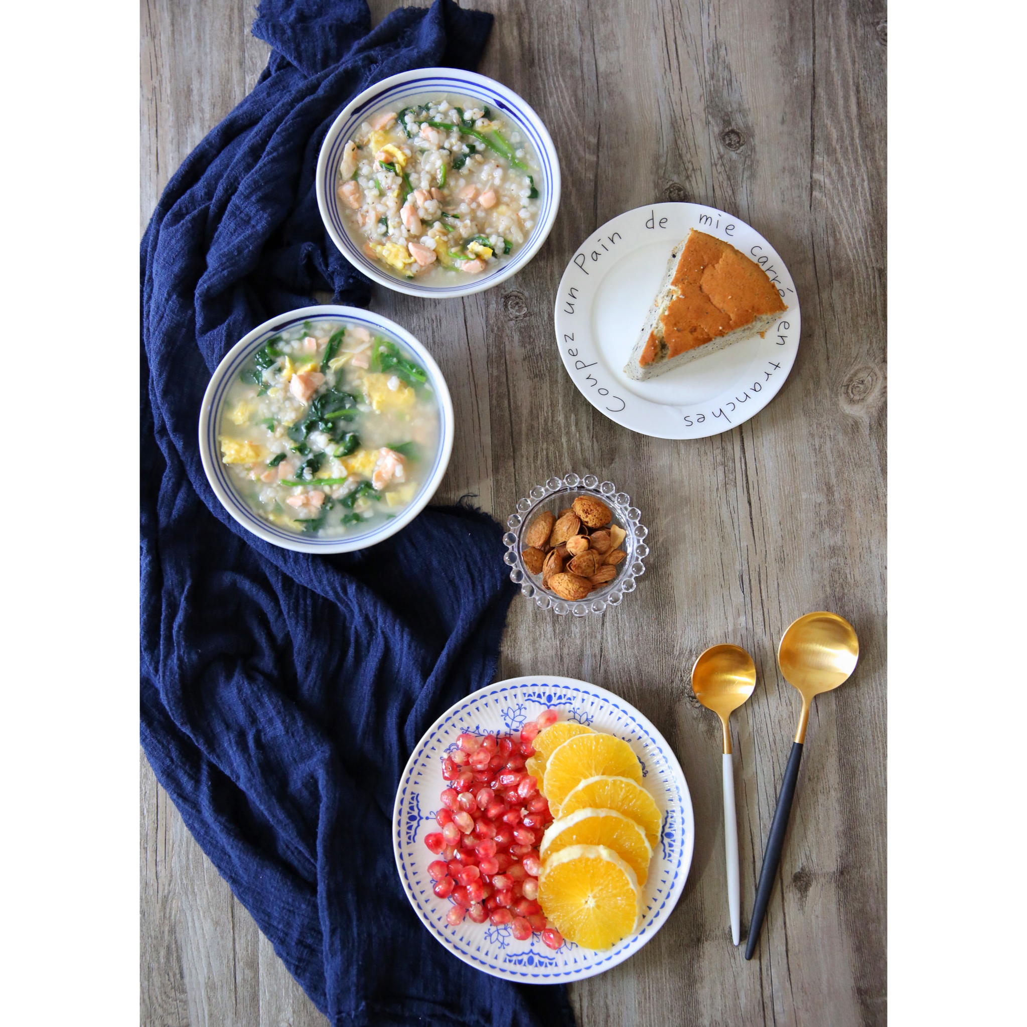 三文鱼菠菜鸡蛋粥,巴旦木,奶酪戚风