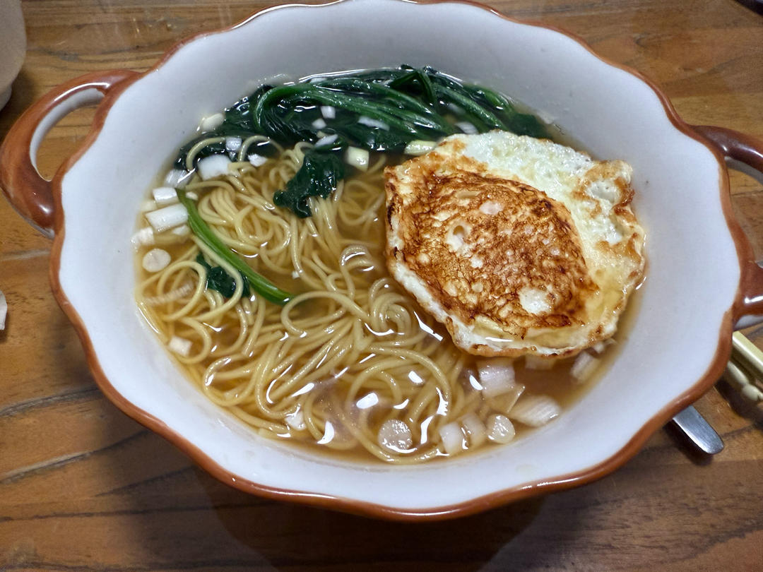下完阳春面,煎个鸡蛋和火腿,吃得很舒服
