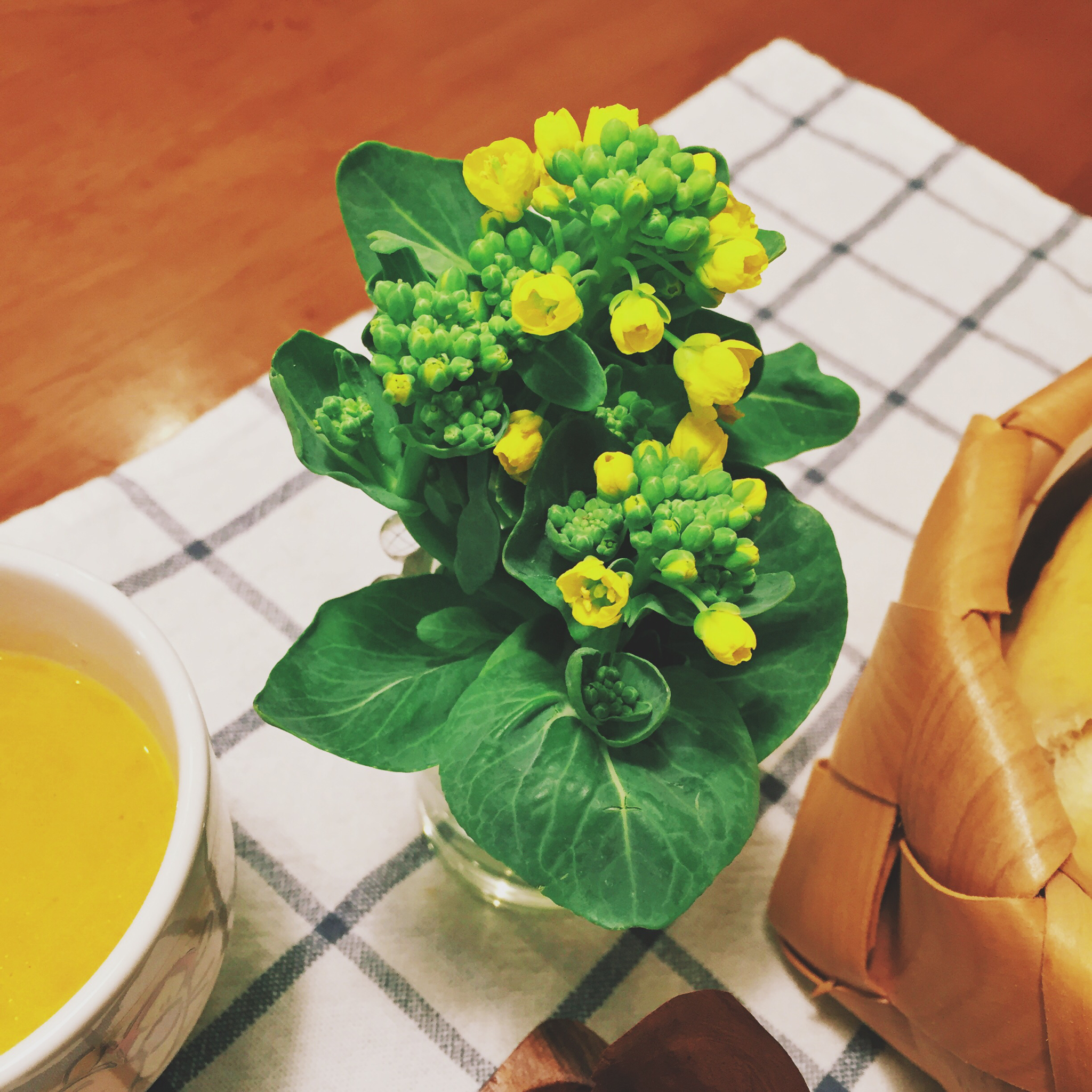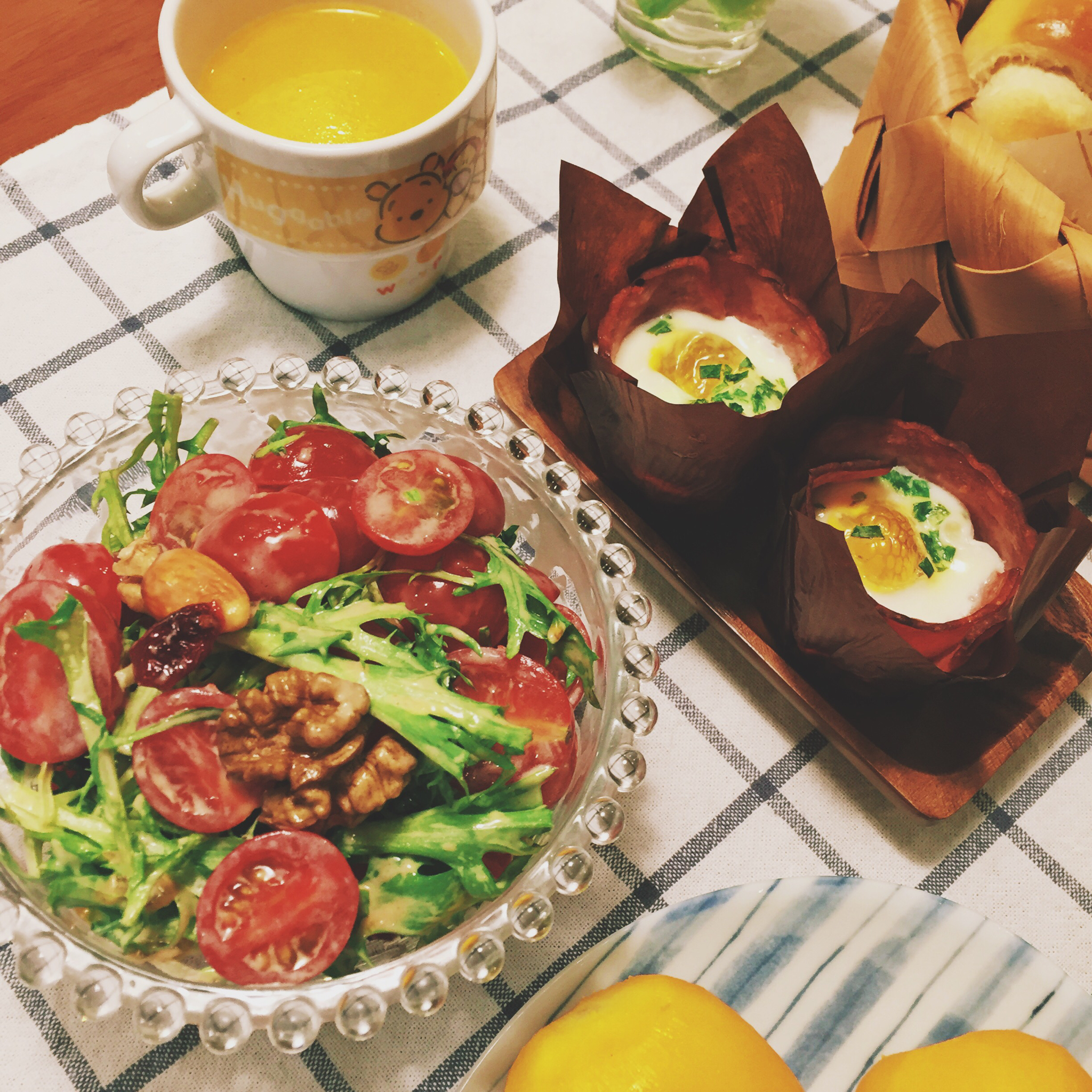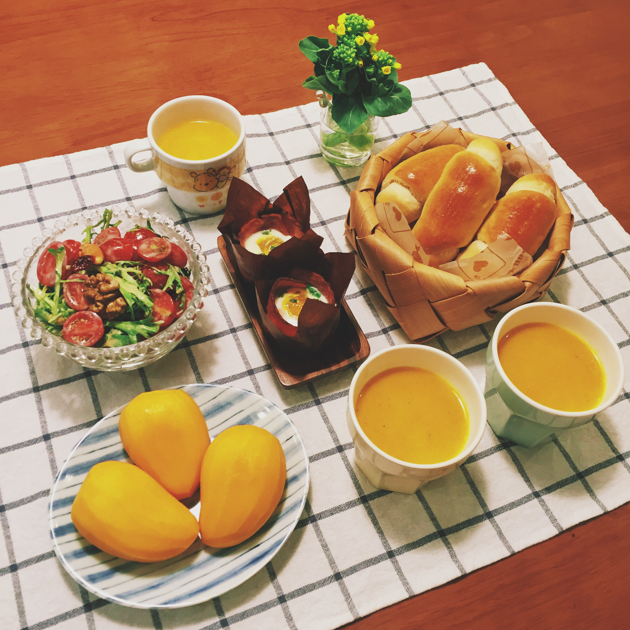 做了黄油卷,本来是想半切夹些菜做成三明治的,烤完觉得颜值太低就不折腾了😂…蔬菜沙拉,培根蛋,胡萝卜浓汤。今天还有餐桌菜花...