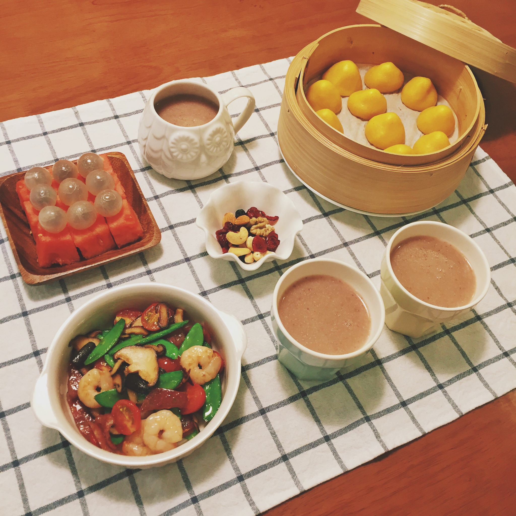 玉米面小窝头,炒时蔬,薏仁赤小豆糙米银耳露…三月猫宁~