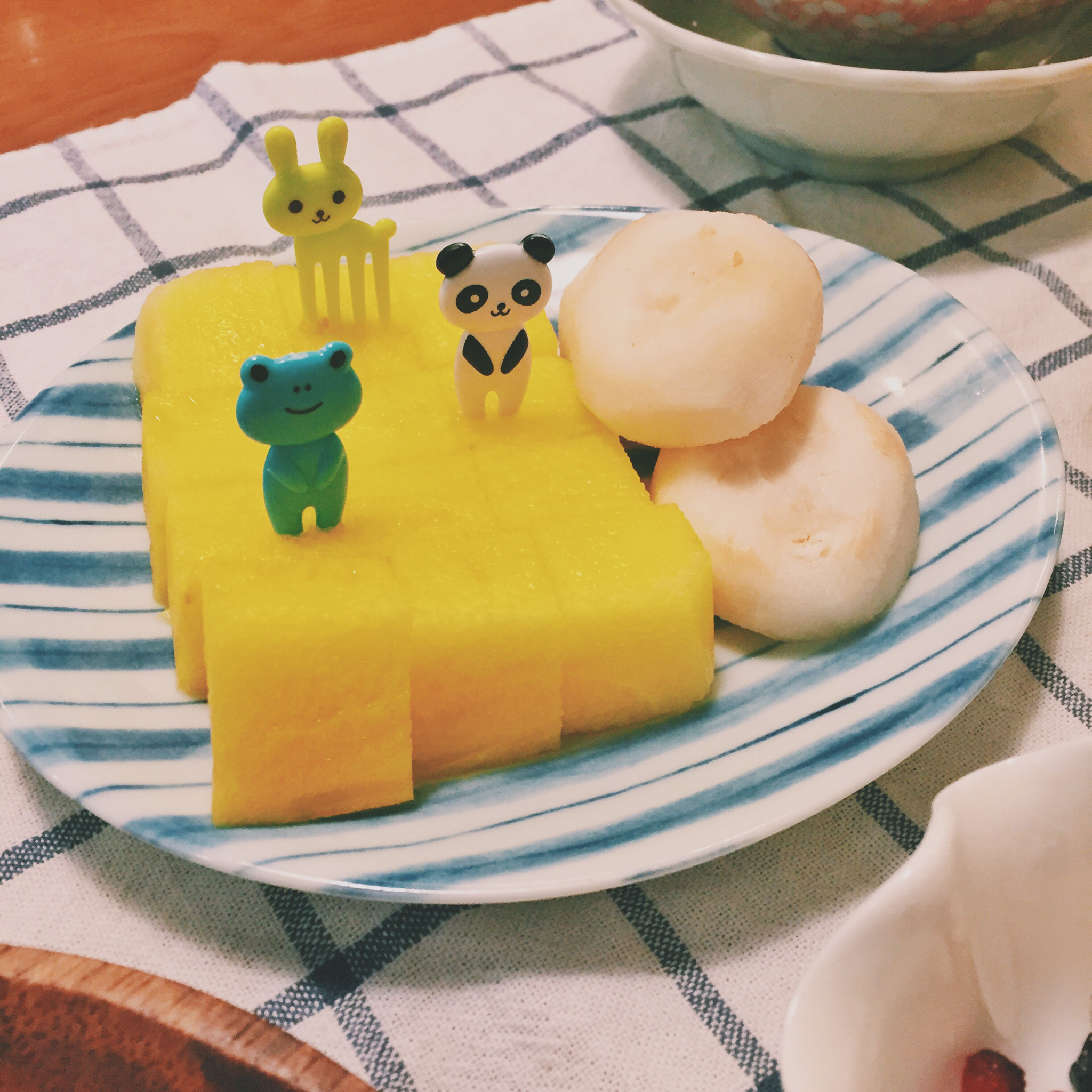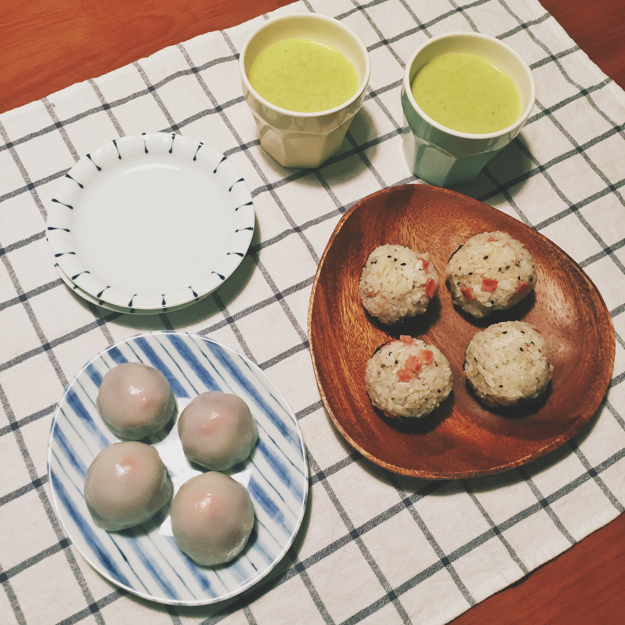 今日晨食,培根芝麻饭团,草莓大福,西兰花土豆浓汤。